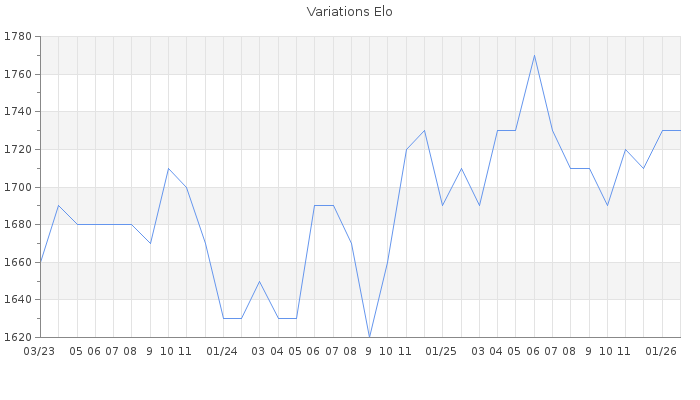 Date d'inscription : 25/05/17. Donateur pour EchecsEmail : Non ( Cliquez ici pour soutenir EchecsEmail. ) Elo non arrondi:1732.8 ( 263 sur 458 joueurs ) Nombre de victoires :401 Nombre de nulles :77 Nombre de défaites :297 Temps de réponse moyen par coup : 0J 2H 13M 36S ( Moyenne sur 834 coups ). Rd ( Un petit rd indique un elo fiable ) : 65 Magic Elo:1394.53 Magic Rd : 105 Elo maximum atteint ( en étant classé ) :1920 Elo maximum atteint cette année :1750 Nombre coups joués : 37411 Classement coupe : Inactif Points coupe : 0 Classement Coupe Magic Chess : Inactif Points Coupe Magic Chess : 0 Tournoi échelle : Inactif. Tournois gagnés : 30/11/2025 : Cat 2 : Victoire dans le tournoi n°27248 18/11/2025 : Cat 2 : Victoire dans le tournoi n°27208 17/10/2025 : Cat 2 : Victoire dans le tournoi n°27002 02/06/2025 : Cat 2 : Victoire dans le tournoi n°26683 18/04/2025 : Cat 2 : Victoire dans le tournoi n°26656 30/03/2025 : Cat 2 : Victoire dans le tournoi n°26572 14/11/2024 : Cat 2 : Victoire dans le tournoi n°26218 09/11/2024 : Cat 2 : Victoire dans le tournoi n°26175 07/11/2024 : Cat 2 : Victoire dans le tournoi n°26192 24/08/2024 : Cat 2 : Victoire dans le tournoi n°26023 08/07/2024 : Cat 2 : Victoire dans le tournoi n°25867 19/06/2024 : Cat 2 : Victoire dans le tournoi n°25847 14/06/2024 : Cat 2 : Victoire dans le tournoi n°25881 23/05/2024 : Cat 2 : Victoire dans le tournoi n°25828 05/05/2024 : Cat 2 : Victoire dans le tournoi n°25770 24/04/2024 : Cat 2 : Victoire dans le tournoi n°25659 03/04/2024 : Cat 2 : Victoire dans le tournoi n°25679 25/11/2023 : Cat 2 : Victoire dans le tournoi n°25022 16/11/2023 : Cat 2 : Victoire dans le tournoi n°25311 26/09/2023 : Cat 2 : Victoire dans le tournoi n°25206 25/08/2023 : Cat 2 : Victoire dans le tournoi n°25078 02/08/2023 : Cat 2 : Victoire dans le tournoi n°25040 28/06/2023 : Cat 2 : Victoire dans le tournoi n°24912 09/05/2023 : Cat 2 : Victoire dans le tournoi n°24861 03/05/2023 : Cat 2 : Victoire dans le tournoi n°24853 17/01/2023 : Cat 3 : Victoire dans le tournoi n°24512 30/08/2022 : Cat 3 : Victoire dans le tournoi n°24153 17/01/2022 : Cat 2 : Victoire dans le tournoi n°23531 09/01/2021 : Cat 2 : Victoire dans le tournoi n°22214 04/10/2020 : Cat 3 : Victoire dans le tournoi n°21582 14/07/2020 : Cat 2 : Victoire dans le tournoi n°21482 06/07/2020 : Cat 2 : Victoire dans le tournoi n°21077 22/05/2020 : Cat 2 : Victoire dans le tournoi n°21146 27/04/2020 : Cat 2 : Victoire dans le tournoi n°21083 21/03/2020 : Cat 2 : Victoire dans le tournoi n°20893 02/10/2019 : Cat 2 : Victoire dans le tournoi n°20128 29/05/2019 : Cat 3 : Victoire dans le tournoi n°19601 08/06/2017 : Cat 1 : Victoire dans le tournoi n°16648 Nombre de tournois gagnés :38