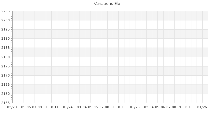 Date d'inscription : 10/11/17. Donateur pour EchecsEmail : Non ( Cliquez ici pour soutenir EchecsEmail. ) Elo non arrondi:2124.3 ( 97 sur 463 joueurs ) Nombre de victoires :299 Nombre de nulles :46 Nombre de défaites :114 Rd ( Un petit rd indique un elo fiable ) : 81 Elo maximum atteint ( en étant classé ) :2400 Elo maximum atteint cette année :0 Nombre coups joués : 15296 Classement coupe : Inactif Points coupe : 0 Classement Coupe Magic Chess : Inactif Points Coupe Magic Chess : 0 Tournoi échelle : Inactif. Tournois gagnés : 23/12/2019 : Cat 5 : Victoire dans le tournoi n°20356 Nombre de tournois gagnés :1