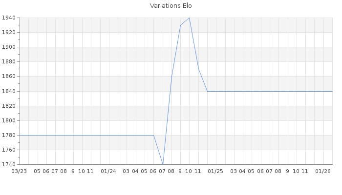 Date d'inscription : 26/11/12. Donateur pour EchecsEmail : Non ( Cliquez ici pour soutenir EchecsEmail. ) Elo non arrondi:1814.1 ( 222 sur 458 joueurs ) Nombre de victoires :168 Nombre de nulles :11 Nombre de défaites :133 Temps de réponse moyen par coup : 0J 13H 32M 43S ( Moyenne sur 0 coups ). Rd ( Un petit rd indique un elo fiable ) : 92 Magic Elo:1600 Magic Rd : 350 Elo maximum atteint ( en étant classé ) :1960 Elo maximum atteint cette année :0 Nombre coups joués : 11000 Classement coupe : Inactif Points coupe : 0 Classement Coupe Magic Chess : Inactif Points Coupe Magic Chess : 0 Tournoi échelle : Inactif. Tournois gagnés : 18/09/2022 : Cat 3 : Victoire dans le tournoi n°24017 06/03/2022 : Cat 3 : Victoire dans le tournoi n°23569 15/02/2022 : Cat 2 : Victoire dans le tournoi n°23435 17/01/2022 : Cat 2 : Premier au tournoi multi Noël 2021 n°4 18/05/2021 : Cat 2 : Premier au tournoi multi Printemps 2021 n°3 16/05/2020 : Cat 2 : Premier au tournoi multi Saint-Valentin 2020 n°1 12/04/2020 : Cat 2 : Premier au tournoi multi Saint-Valentin 2020 n°2 29/08/2019 : Cat 2 : Premier au tournoi multi Printemps 2019 n°1 13/05/2019 : Cat 2 : Premier au tournoi multi Printemps 2019 n°3 22/10/2018 : Cat 2 : Premier au tournoi multi Automne 2018 n°3 02/05/2018 : Cat 2 : Premier au tournoi multi Printemps 2018 n°2 20/02/2018 : Cat 0 : Premier au tournoi multi Noël 2017 n°5 14/11/2017 : Cat 2 : Premier au tournoi multi Halloween 2017 n°3 06/08/2016 : Cat 0 : Premier au tournoi multi Eté 2016 n°4 01/02/2016 : Cat 0 : Premier au tournoi multi Noël 2015 n°6 Nombre de tournois gagnés :21