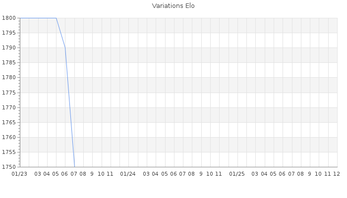 Date d'inscription : 05/03/21. Donateur pour EchecsEmail : Non ( Cliquez ici pour soutenir EchecsEmail. ) Elo non arrondi:1716.2 ( 292 sur 448 joueurs ) Nombre de victoires :87 Nombre de nulles :3 Nombre de défaites :48 Temps de réponse moyen par coup : 0J 4H 4M 29S ( Moyenne sur 0 coups ). Rd ( Un petit rd indique un elo fiable ) : 83 Elo maximum atteint ( en étant classé ) :1890 Elo maximum atteint cette année :0 Nombre coups joués : 3835 Classement coupe : Inactif Points coupe : 0 Classement Coupe Magic Chess : Inactif Points Coupe Magic Chess : 0 Tournoi échelle : Tournois gagnés : 11/05/2022 : Cat 3 : Victoire dans le tournoi n°23921 08/01/2022 : Cat 2 : Victoire dans le tournoi n°23508 17/11/2021 : Cat 2 : Victoire dans le tournoi n°23353 29/10/2021 : Cat 2 : Victoire dans le tournoi n°23269 04/08/2021 : Cat 0 : Victoire dans le tournoi n°22895 Nombre de tournois gagnés :5
