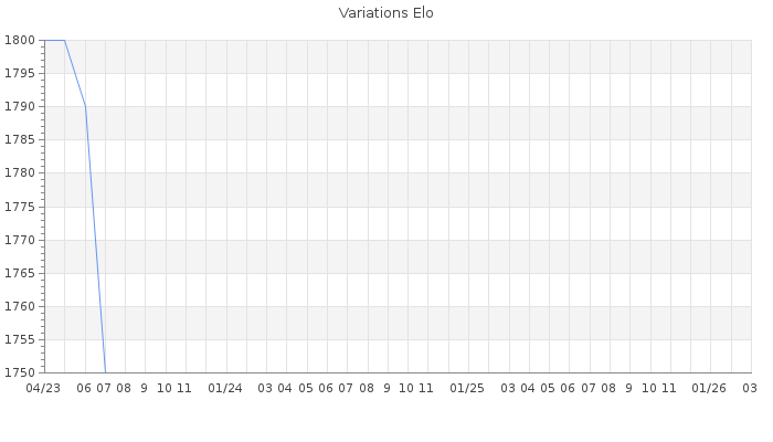 Date d'inscription : 05/03/21. Donateur pour EchecsEmail : Non ( Cliquez ici pour soutenir EchecsEmail. ) Elo non arrondi:1708.2 ( 292 sur 445 joueurs ) Nombre de victoires :87 Nombre de nulles :3 Nombre de défaites :48 Temps de réponse moyen par coup : 0J 4H 4M 29S ( Moyenne sur 0 coups ). Rd ( Un petit rd indique un elo fiable ) : 83 Elo maximum atteint ( en étant classé ) :1890 Elo maximum atteint cette année :0 Nombre coups joués : 3835 Classement coupe : Inactif Points coupe : 0 Classement Coupe Magic Chess : Inactif Points Coupe Magic Chess : 0 Tournoi échelle : Tournois gagnés : 11/05/2022 : Cat 3 : Victoire dans le tournoi n°23921 08/01/2022 : Cat 2 : Victoire dans le tournoi n°23508 17/11/2021 : Cat 2 : Victoire dans le tournoi n°23353 29/10/2021 : Cat 2 : Victoire dans le tournoi n°23269 04/08/2021 : Cat 0 : Victoire dans le tournoi n°22895 Nombre de tournois gagnés :5
