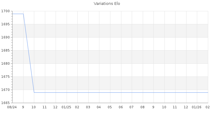 Date d'inscription : 19/08/24. Donateur pour EchecsEmail : Non ( Cliquez ici pour soutenir EchecsEmail. ) Elo non arrondi:1637 ( 332 sur 458 joueurs ) Nombre de victoires :0 Nombre de nulles :0 Nombre de défaites :1 Temps de réponse moyen par coup : 1J 0H 40M 23S ( Moyenne sur 0 coups ). Rd ( Un petit rd indique un elo fiable ) : 322 Elo maximum atteint ( en étant classé ) :0 Elo maximum atteint cette année :0 Nombre coups joués : 39 Classement coupe : Inactif Points coupe : 0 Classement Coupe Magic Chess : Inactif Points Coupe Magic Chess : 0 Tournoi échelle : Nombre de tournois gagnés :0