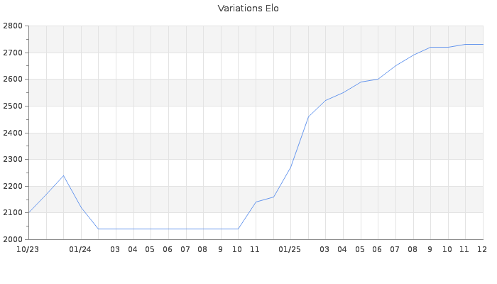 Date d'inscription : 11/10/23. Donateur pour EchecsEmail : Non ( Cliquez ici pour soutenir EchecsEmail. ) Elo non arrondi:2726.9 ( 10 sur 449 joueurs ) Nombre de victoires :82 Nombre de nulles :16 Nombre de défaites :19 Temps de réponse moyen par coup : 0J 22H 33M 20S ( Moyenne sur 402 coups ). Rd ( Un petit rd indique un elo fiable ) : 78 Magic Elo:1700 Magic Rd : 350 Elo maximum atteint ( en étant classé ) :2730 Elo maximum atteint cette année :2730 Nombre coups joués : 3506 Inscrit dans l' équipe:La Crim Team Classement coupe : 64 Points coupe : 341.09 Classement Coupe Magic Chess : Inactif Points Coupe Magic Chess : 0 Tournoi échelle : Inactif. Tournois gagnés : 11/09/2025 : Cat 7 : Victoire dans le tournoi n°26806 25/08/2025 : Cat 7 : Victoire dans le tournoi n°26867 24/08/2025 : Cat 7 : Victoire dans le tournoi n°26560 04/06/2025 : Cat 7 : Victoire dans le tournoi n°26495 20/05/2025 : Cat 6 : Victoire dans le tournoi n°26448 22/03/2025 : Cat 5 : Victoire dans le tournoi n°26339 10/02/2025 : Cat 5 : Victoire dans le tournoi n°26282 04/02/2025 : Cat 6 : Victoire dans le tournoi n°26342 02/02/2025 : Cat 5 : Victoire dans le tournoi n°26266 15/01/2025 : Cat 5 : Victoire dans le tournoi n°26169 03/03/2024 : Cat 4 : Victoire dans le tournoi n°25318 22/01/2024 : Cat 4 : Victoire dans le tournoi n°25296 16/01/2024 : Cat 5 : Victoire dans le tournoi n°25248 22/12/2023 : Cat 3 : Victoire dans le tournoi n°25307 25/10/2023 : Cat 2 : Victoire dans le tournoi n°25275 Nombre de tournois gagnés :15