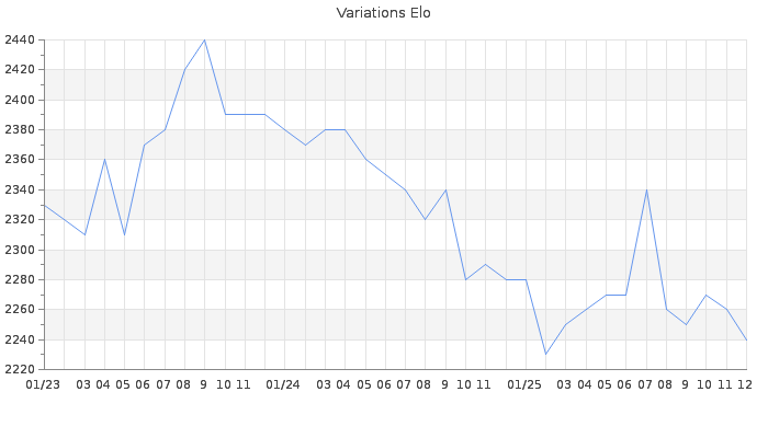 Date d'inscription : 28/01/10. Donateur pour EchecsEmail : Non ( Cliquez ici pour soutenir EchecsEmail. ) Elo non arrondi:2238.8 ( 49 sur 452 joueurs ) Nombre de victoires :3539 Nombre de nulles :1276 Nombre de défaites :1408 Temps de réponse moyen par coup : 0J 8H 55M 40S ( Moyenne sur 782 coups ). Rd ( Un petit rd indique un elo fiable ) : 61 Magic Elo:1600 Magic Rd : 350 Elo maximum atteint ( en étant classé ) :2450 Elo maximum atteint cette année :2340 Nombre coups joués : 195080 Inscrit dans l' équipe:modesty Classement coupe : 10 Points coupe : 8828.45 Classement Coupe Magic Chess : Inactif Points Coupe Magic Chess : 0 Tournoi échelle : Inactif. Tournois gagnés : 11/04/2025 : Cat 5 : Victoire dans le tournoi n°26511 23/02/2025 : Cat 5 : Victoire dans le tournoi n°26034 22/11/2024 : Cat 5 : Victoire dans le tournoi n°26208 18/10/2024 : Cat 5 : Victoire dans le tournoi n°26086 08/06/2023 : Cat 5 : Victoire dans le tournoi n°24733 10/04/2023 : Cat 5 : Victoire dans le tournoi n°24758 10/04/2022 : Cat 6 : Victoire dans le tournoi n°23541 15/02/2022 : Cat 5 : Victoire dans le tournoi n°23586 08/02/2022 : Cat 5 : Victoire dans le tournoi n°23542 29/01/2022 : Cat 5 : Victoire dans le tournoi n°23529 28/01/2022 : Cat 5 : Victoire dans le tournoi n°23491 26/12/2021 : Cat 5 : Victoire dans le tournoi n°23350 21/12/2021 : Cat 5 : Victoire dans le tournoi n°23232 09/12/2021 : Cat 5 : Victoire dans le tournoi n°23260 28/11/2021 : Cat 5 : Victoire dans le tournoi n°23364 25/11/2021 : Cat 5 : Victoire dans le tournoi n°23337 11/11/2021 : Cat 5 : Victoire dans le tournoi n°23259 06/11/2021 : Cat 5 : Victoire dans le tournoi n°23197 03/11/2021 : Cat 5 : Victoire dans le tournoi n°23205 03/10/2021 : Cat 5 : Victoire dans le tournoi n°23146 12/08/2021 : Cat 5 : Victoire dans le tournoi n°22931 05/08/2021 : Cat 5 : Victoire dans le tournoi n°22954 06/07/2021 : Cat 5 : Victoire dans le tournoi n°22865 11/05/2021 : Cat 5 : Victoire dans le tournoi n°22626 08/05/2021 : Cat 5 : Victoire dans le tournoi n°22566 03/05/2021 : Cat 5 : Victoire dans le tournoi n°22510 24/04/2021 : Cat 5 : Victoire dans le tournoi n°22478 30/03/2021 : Cat 5 : Victoire dans le tournoi n°22533 22/03/2021 : Cat 5 : Victoire dans le tournoi n°22441 17/03/2021 : Cat 5 : Victoire dans le tournoi n°22327 05/03/2021 : Cat 5 : Victoire dans le tournoi n°22395 23/02/2021 : Cat 5 : Victoire dans le tournoi n°22367 22/02/2021 : Cat 5 : Victoire dans le tournoi n°22297 14/02/2021 : Cat 5 : Victoire dans le tournoi n°22346 31/01/2021 : Cat 5 : Victoire dans le tournoi n°22242 21/11/2020 : Cat 5 : Victoire dans le tournoi n°21899 03/11/2020 : Cat 5 : Victoire dans le tournoi n°21780 26/10/2020 : Cat 5 : Victoire dans le tournoi n°21811 21/10/2020 : Cat 5 : Victoire dans le tournoi n°21669 19/10/2020 : Cat 5 : Victoire dans le tournoi n°21858 13/10/2020 : Cat 5 : Victoire dans le tournoi n°21761 10/10/2020 : Cat 5 : Victoire dans le tournoi n°21691 28/09/2020 : Cat 5 : Victoire dans le tournoi n°21656 25/09/2020 : Cat 5 : Victoire dans le tournoi n°21697 22/09/2020 : Cat 5 : Victoire dans le tournoi n°21724 03/09/2020 : Cat 5 : Victoire dans le tournoi n°21572 22/07/2020 : Cat 5 : Victoire dans le tournoi n°21513 21/07/2020 : Cat 5 : Victoire dans le tournoi n°21252 21/07/2020 : Cat 5 : Victoire dans le tournoi n°21408 22/06/2020 : Cat 5 : Victoire dans le tournoi n°21333 11/04/2020 : Cat 5 : Victoire dans le tournoi n°20770 25/03/2020 : Cat 5 : Victoire dans le tournoi n°20886 22/02/2020 : Cat 5 : Victoire dans le tournoi n°20690 21/02/2020 : Cat 5 : Victoire dans le tournoi n°20691 03/02/2020 : Cat 5 : Victoire dans le tournoi n°20537 01/01/2020 : Cat 5 : Victoire dans le tournoi n°20191 01/01/2020 : Cat 5 : Victoire dans le tournoi n°20479 23/12/2019 : Cat 5 : Victoire dans le tournoi n°20469 24/10/2019 : Cat 5 : Victoire dans le tournoi n°20120 17/10/2019 : Cat 5 : Victoire dans le tournoi n°20173 15/10/2019 : Cat 5 : Victoire dans le tournoi n°20062 12/10/2019 : Cat 5 : Victoire dans le tournoi n°20148 25/09/2019 : Cat 5 : Victoire dans le tournoi n°20031 03/03/2019 : Cat 5 : Victoire dans le tournoi n°19102 11/02/2019 : Cat 5 : Victoire dans le tournoi n°19167 14/01/2019 : Cat 5 : Victoire dans le tournoi n°18884 20/11/2018 : Cat 5 : Victoire dans le tournoi n°18650 02/11/2018 : Cat 5 : Victoire dans le tournoi n°18692 02/11/2018 : Cat 5 : Victoire dans le tournoi n°18678 30/10/2018 : Cat 5 : Victoire dans le tournoi n°18745 22/10/2018 : Cat 5 : Victoire dans le tournoi n°18605 03/10/2018 : Cat 5 : Victoire dans le tournoi n°18446 20/09/2018 : Cat 5 : Victoire dans le tournoi n°18408 15/09/2018 : Cat 5 : Victoire dans le tournoi n°18374 11/09/2018 : Cat 5 : Victoire dans le tournoi n°18273 24/04/2018 : Cat 6 : Victoire dans le tournoi n°17729 16/01/2018 : Cat 5 : Victoire dans le tournoi n°17267 31/12/2017 : Cat 5 : Victoire dans le tournoi n°17307 22/12/2017 : Cat 5 : Victoire dans le tournoi n°17203 20/12/2017 : Cat 5 : Victoire dans le tournoi n°17375 17/10/2017 : Cat 6 : Victoire dans le tournoi n°17035 09/04/2017 : Cat 5 : Victoire dans le tournoi n°16254 06/04/2017 : Cat 5 : Victoire dans le tournoi n°16131 30/03/2017 : Cat 5 : Victoire dans le tournoi n°16228 21/12/2016 : Cat 5 : Victoire dans le tournoi n°15595 04/12/2016 : Cat 5 : Victoire dans le tournoi n°15584 27/11/2016 : Cat 5 : Victoire dans le tournoi n°15638 09/11/2016 : Cat 5 : Victoire dans le tournoi n°15458 22/09/2016 : Cat 5 : Victoire dans le tournoi n°15084 08/09/2016 : Cat 5 : Victoire dans le tournoi n°15175 31/08/2016 : Cat 5 : Victoire dans le tournoi n°15076 20/08/2016 : Cat 5 : Victoire dans le tournoi n°15005 16/08/2016 : Cat 5 : Victoire dans le tournoi n°15048 05/08/2016 : Cat 5 : Victoire dans le tournoi n°15185 03/08/2016 : Cat 5 : Victoire dans le tournoi n°14933 28/07/2016 : Cat 5 : Victoire dans le tournoi n°14896 27/07/2016 : Cat 5 : Victoire dan
