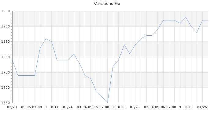 Date d'inscription : 19/06/09. Donateur pour EchecsEmail : Non ( Cliquez ici pour soutenir EchecsEmail. ) Elo non arrondi:1919.8 ( 170 sur 458 joueurs ) Nombre de victoires :1488 Nombre de nulles :169 Nombre de défaites :1034 Temps de réponse moyen par coup : 0J 20H 39M 16S ( Moyenne sur 1325 coups ). Rd ( Un petit rd indique un elo fiable ) : 61 Magic Elo:1273.02 Magic Rd : 292 Elo maximum atteint ( en étant classé ) :1980 Elo maximum atteint cette année :1930 Nombre coups joués : 103667 Inscrit dans l' équipe:les saints Classement coupe : Inactif, date de la dernière qualification : 14/04/24 Points coupe : 5.33 Classement Coupe Magic Chess : Inactif Points Coupe Magic Chess : 0 Tournoi échelle : Inactif. Tournois gagnés : 06/02/2026 : Cat 3 : Victoire dans le tournoi n°27351 30/07/2024 : Cat 2 : Victoire dans le tournoi n°25920 28/08/2022 : Cat 2 : Victoire dans le tournoi n°23890 03/06/2022 : Cat 2 : Victoire dans le tournoi n°23888 21/05/2022 : Cat 2 : Victoire dans le tournoi n°23885 11/11/2021 : Cat 2 : Premier au tournoi multi Automne 2021 n°2 28/06/2021 : Cat 2 : Victoire dans le tournoi n°22721 26/05/2021 : Cat 2 : Victoire dans le tournoi n°22720 26/10/2020 : Cat 3 : Victoire dans le tournoi n°21859 28/06/2020 : Cat 4 : Victoire dans le tournoi n°21053 07/02/2020 : Cat 3 : Premier au tournoi multi Noël 2019 n°5 30/12/2019 : Cat 2 : Premier au tournoi multi Automne 2019 n°1 24/10/2019 : Cat 2 : Premier au tournoi multi Automne 2019 n°4 15/09/2019 : Cat 3 : Premier au tournoi multi Eté 2019 n°1 01/09/2019 : Cat 2 : Victoire dans le tournoi n°20005 20/08/2019 : Cat 1 : Premier au tournoi multi Eté 2019 n°4 28/02/2019 : Cat 1 : Premier au tournoi multi Saint-Valentin 2019 n°3 27/12/2017 : Cat 3 : Victoire dans le tournoi n°17380 29/11/2017 : Cat 3 : Victoire dans le tournoi n°17265 29/11/2017 : Cat 2 : Victoire dans le tournoi n°17102 18/09/2017 : Cat 3 : Victoire dans le tournoi n°16706 08/09/2016 : Cat 2 : Victoire dans le tournoi n°14695 17/05/2016 : Cat 0 : Premier au tournoi multi Printemps 2016 n°6 31/03/2016 : Cat 0 : Premier au tournoi multi Saint-Valentin 2016 n°6 09/07/2015 : Cat 2 : Victoire dans le tournoi n°17935 07/07/2015 : Cat 2 : Victoire dans le tournoi n°17881 30/04/2015 : Cat 2 : Victoire dans le tournoi n°16945 22/07/2014 : Cat 3 : Victoire dans le tournoi n°15316 30/01/2014 : Cat 3 : Victoire dans le tournoi n°14523 20/01/2014 : Cat 2 : Victoire dans le tournoi n°14385 05/01/2014 : Cat 2 : Victoire dans le tournoi n°14137 26/05/2013 : Cat 3 : Victoire dans le tournoi n°12357 22/01/2013 : Cat 3 : Victoire dans le tournoi n°11281 06/01/2013 : Cat 2 : Victoire dans le tournoi n°11282 27/06/2012 : Cat 3 : Victoire dans le tournoi n°9999 08/02/2012 : Cat 3 : Victoire dans le tournoi n°9540 16/09/2011 : Cat 2 : Victoire dans le tournoi n°8851 12/03/2011 : Cat 2 : Victoire dans le tournoi n°8365 26/10/2009 : Cat 2 : Victoire dans le tournoi n°6290 25/10/2009 : Cat 2 : Victoire dans le tournoi n°6390 19/09/2009 : Cat 2 : Victoire dans le tournoi n°6260 16/09/2009 : Cat 0 : Victoire dans le tournoi n°6147 14/08/2009 : Cat 1 : Victoire dans le tournoi n°6189 07/08/2009 : Cat 0 : Victoire dans le tournoi n°6126 Nombre de tournois gagnés :51