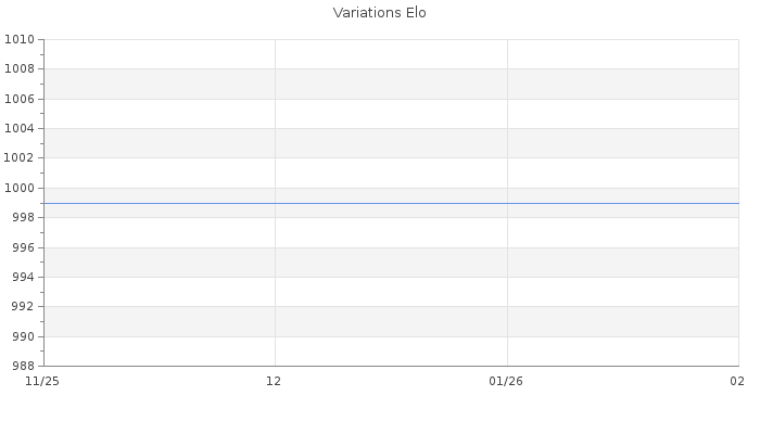 Date d'inscription : 22/11/25. Donateur pour EchecsEmail : Non ( Cliquez ici pour soutenir EchecsEmail. ) Elo non arrondi:997 ( 463 sur 459 joueurs ) Nombre de victoires :0 Nombre de nulles :0 Nombre de défaites :1 Temps de réponse moyen par coup : 1J 14H 45M 45S ( Moyenne sur 3 coups ). Rd ( Un petit rd indique un elo fiable ) : 255 Elo maximum atteint ( en étant classé ) :0 Elo maximum atteint cette année :0 Nombre coups joués : 9 Classement coupe : Inactif Points coupe : 0 Classement Coupe Magic Chess : Inactif Points Coupe Magic Chess : 0 Tournoi échelle : Nombre de tournois gagnés :0