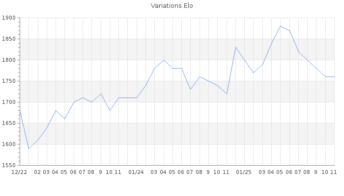 Date d'inscription : 21/02/10. Donateur pour EchecsEmail : Non ( Cliquez ici pour soutenir EchecsEmail. ) Elo non arrondi:1764.9 ( 251 sur 461 joueurs ) Nombre de victoires :1078 Nombre de nulles :169 Nombre de défaites :1481 Temps de réponse moyen par coup : 0J 10H 34M 27S ( Moyenne sur 426 coups ). Rd ( Un petit rd indique un elo fiable ) : 68 Magic Elo:1494.28 Magic Rd : 274 Elo maximum atteint ( en étant classé ) :2000 Elo maximum atteint cette année :1890 Nombre coups joués : 111760 Classement coupe : Inactif Points coupe : 0.03 Classement Coupe Magic Chess : Inactif Points Coupe Magic Chess : 0 Tournoi échelle : Inactif. Tournois gagnés : 10/05/2025 : Cat 3 : Victoire dans le tournoi n°26646 15/11/2024 : Cat 3 : Victoire dans le tournoi n°25997 05/01/2024 : Cat 3 : Victoire dans le tournoi n°25377 14/11/2023 : Cat 3 : Victoire dans le tournoi n°25302 02/06/2023 : Cat 3 : Victoire dans le tournoi n°24780 21/03/2023 : Cat 2 : Victoire dans le tournoi n°24625 18/03/2021 : Cat 3 : Victoire dans le tournoi n°22394 05/01/2021 : Cat 3 : Victoire dans le tournoi n°22067 20/06/2020 : Cat 3 : Victoire dans le tournoi n°21308 19/05/2020 : Cat 3 : Victoire dans le tournoi n°21253 25/09/2018 : Cat 3 : Victoire dans le tournoi n°18583 10/05/2018 : Cat 3 : Victoire dans le tournoi n°18063 12/06/2015 : Cat 4 : Victoire dans le tournoi n°17534 17/12/2014 : Cat 3 : Victoire dans le tournoi n°16457 01/11/2014 : Cat 3 : Victoire dans le tournoi n°16022 12/10/2014 : Cat 3 : Victoire dans le tournoi n°16046 29/03/2014 : Cat 3 : Victoire dans le tournoi n°14454 05/03/2014 : Cat 3 : Victoire dans le tournoi n°14397 30/05/2013 : Cat 3 : Victoire dans le tournoi n°12532 02/01/2013 : Cat 3 : Victoire dans le tournoi n°10995 25/12/2012 : Cat 4 : Victoire dans le tournoi n°11156 16/11/2012 : Cat 3 : Victoire dans le tournoi n°11011 10/09/2012 : Cat 3 : Victoire dans le tournoi n°10460 08/02/2012 : Cat 4 : Victoire dans le tournoi n°9249 06/02/2012 : Cat 4 : Victoire dans le tournoi n°9436 30/01/2012 : Cat 3 : Victoire dans le tournoi n°9656 29/10/2011 : Cat 4 : Victoire dans le tournoi n°9286 03/10/2011 : Cat 3 : Victoire dans le tournoi n°9126 27/03/2011 : Cat 3 : Victoire dans le tournoi n°8431 29/01/2011 : Cat 3 : Victoire dans le tournoi n°8186 26/01/2011 : Cat 3 : Victoire dans le tournoi n°8102 16/12/2010 : Cat 3 : Victoire dans le tournoi n°8037 09/10/2010 : Cat 3 : Victoire dans le tournoi n°7852 30/09/2010 : Cat 3 : Victoire dans le tournoi n°7824 25/09/2010 : Cat 2 : Victoire dans le tournoi n°7635 18/09/2010 : Cat 2 : Victoire dans le tournoi n°7692 25/07/2010 : Cat 2 : Victoire dans le tournoi n°7560 27/06/2010 : Cat 2 : Victoire dans le tournoi n°7500 10/06/2010 : Cat 2 : Victoire dans le tournoi n°7433 Nombre de tournois gagnés :39