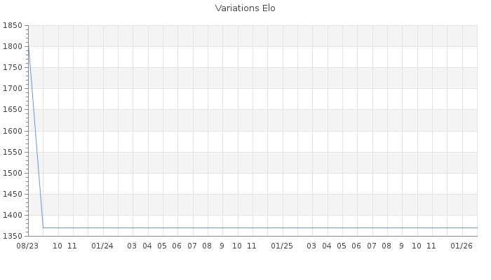 Date d'inscription : 25/08/23. Donateur pour EchecsEmail : Non ( Cliquez ici pour soutenir EchecsEmail. ) Elo non arrondi:1333 ( 476 sur 458 joueurs ) Nombre de victoires :0 Nombre de nulles :0 Nombre de défaites :10 Temps de réponse moyen par coup : 0J 23H 46M 16S ( Moyenne sur 0 coups ). Rd ( Un petit rd indique un elo fiable ) : 134 Elo maximum atteint ( en étant classé ) :1410 Elo maximum atteint cette année :0 Nombre coups joués : 200 Classement coupe : Inactif, date de la dernière qualification : 28/08/23 Points coupe : 0 Classement Coupe Magic Chess : Inactif Points Coupe Magic Chess : 0 Tournoi échelle : Nombre de tournois gagnés :0