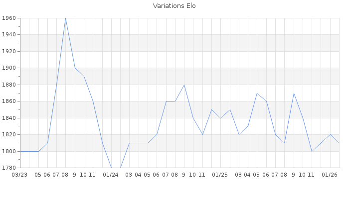 Date d'inscription : 23/04/10. Donateur pour EchecsEmail : Non ( Cliquez ici pour soutenir EchecsEmail. ) Elo non arrondi:1809 ( 224 sur 463 joueurs ) Nombre de victoires :942 Nombre de nulles :59 Nombre de défaites :583 Temps de réponse moyen par coup : 0J 8H 41M 16S ( Moyenne sur 1055 coups ). Rd ( Un petit rd indique un elo fiable ) : 61 Magic Elo:1600 Magic Rd : 350 Elo maximum atteint ( en étant classé ) :2180 Elo maximum atteint cette année :1840 Nombre coups joués : 56443 Classement coupe : Inactif Points coupe : 0 Classement Coupe Magic Chess : Inactif Points Coupe Magic Chess : 0 Tournoi échelle : Nombre de tournois gagnés :0