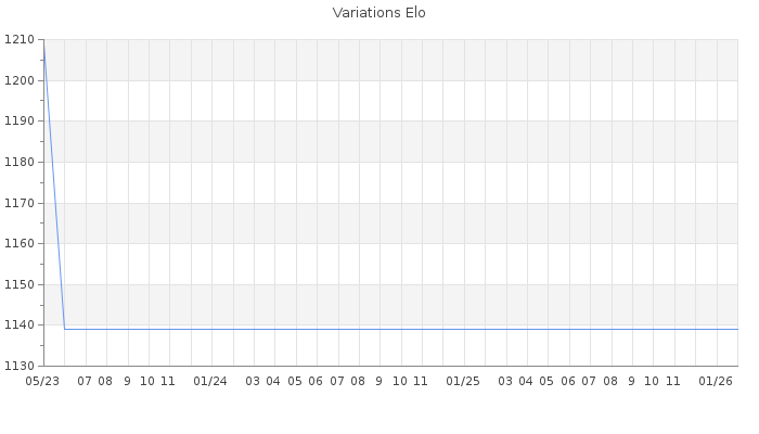 Date d'inscription : 09/05/23. Donateur pour EchecsEmail : Non ( Cliquez ici pour soutenir EchecsEmail. ) Elo non arrondi:1100.4 ( 531 sur 458 joueurs ) Nombre de victoires :0 Nombre de nulles :0 Nombre de défaites :8 Temps de réponse moyen par coup : 1J 17H 22M 19S ( Moyenne sur 0 coups ). Rd ( Un petit rd indique un elo fiable ) : 169 Elo maximum atteint ( en étant classé ) :0 Elo maximum atteint cette année :0 Nombre coups joués : 342 Classement coupe : Inactif Points coupe : 0 Classement Coupe Magic Chess : Inactif Points Coupe Magic Chess : 0 Tournoi échelle : Nombre de tournois gagnés :0