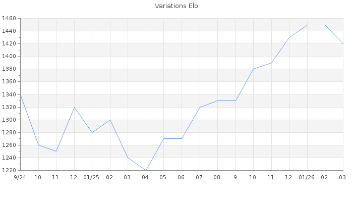 Date d'inscription : 07/09/24. Donateur pour EchecsEmail : Non ( Cliquez ici pour soutenir EchecsEmail. ) Elo non arrondi:1417.7 ( 386 sur 439 joueurs ) Nombre de victoires :57 Nombre de nulles :0 Nombre de défaites :94 Temps de réponse moyen par coup : 0J 4H 26M 40S ( Moyenne sur 424 coups ). Rd ( Un petit rd indique un elo fiable ) : 65 Elo maximum atteint ( en étant classé ) :1450 Elo maximum atteint cette année :1450 Nombre coups joués : 4073 Classement coupe : Inactif Points coupe : 0 Classement Coupe Magic Chess : Inactif Points Coupe Magic Chess : 0 Tournoi échelle : Tournois gagnés : 01/12/2025 : Cat 1 : Victoire dans le tournoi n°27220 26/10/2025 : Cat 1 : Victoire dans le tournoi n°27128 11/06/2025 : Cat 1 : Victoire dans le tournoi n°26662 05/03/2025 : Cat 1 : Victoire dans le tournoi n°26506 Nombre de tournois gagnés :4