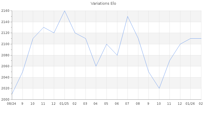 Date d'inscription : 25/08/24. Donateur pour EchecsEmail : Non ( Cliquez ici pour soutenir EchecsEmail. ) Elo non arrondi:2114.6 ( 86 sur 463 joueurs ) Nombre de victoires :566 Nombre de nulles :85 Nombre de défaites :327 Temps de réponse moyen par coup : 0J 1H 35M 22S ( Moyenne sur 3243 coups ). Rd ( Un petit rd indique un elo fiable ) : 59 Magic Elo:1700 Magic Rd : 350 Elo maximum atteint ( en étant classé ) :2200 Elo maximum atteint cette année :2130 Nombre coups joués : 32323 Classement coupe : 12 Points coupe : 8077.12 Classement Coupe Magic Chess : Inactif Points Coupe Magic Chess : 0 Tournoi échelle : Inactif. Tournois gagnés : 13/01/2026 : Cat 5 : Victoire dans le tournoi n°27322 02/12/2025 : Cat 4 : Victoire dans le tournoi n°27221 25/11/2025 : Cat 4 : Victoire dans le tournoi n°27160 14/11/2025 : Cat 4 : Victoire dans le tournoi n°27206 27/07/2025 : Cat 5 : Victoire dans le tournoi n°26866 20/07/2025 : Cat 4 : Victoire dans le tournoi n°26907 07/07/2025 : Cat 4 : Victoire dans le tournoi n°26846 06/07/2025 : Cat 4 : Victoire dans le tournoi n°26853 30/06/2025 : Cat 4 : Victoire dans le tournoi n°26817 02/06/2025 : Cat 4 : Victoire dans le tournoi n°26751 09/05/2025 : Cat 4 : Victoire dans le tournoi n°26700 08/05/2025 : Cat 4 : Victoire dans le tournoi n°26726 28/04/2025 : Cat 4 : Victoire dans le tournoi n°26685 12/11/2024 : Cat 4 : Victoire dans le tournoi n°26132 04/11/2024 : Cat 4 : Victoire dans le tournoi n°26185 26/10/2024 : Cat 4 : Victoire dans le tournoi n°26161 13/10/2024 : Cat 4 : Victoire dans le tournoi n°26148 06/09/2024 : Cat 2 : Victoire dans le tournoi n°26049 Nombre de tournois gagnés :18
