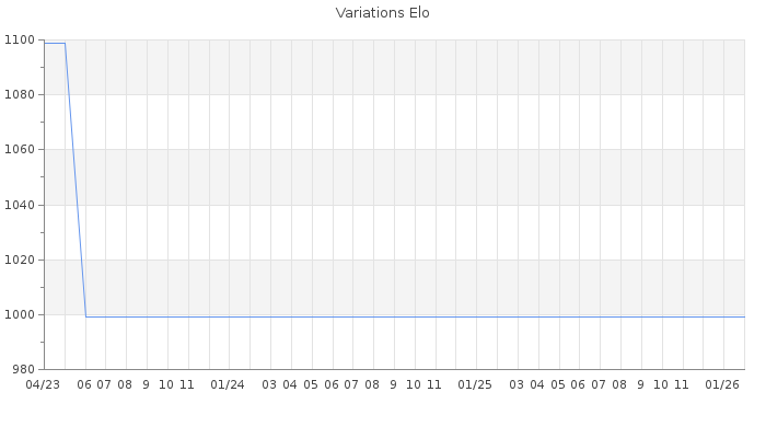 Date d'inscription : 29/04/23. Donateur pour EchecsEmail : Non ( Cliquez ici pour soutenir EchecsEmail. ) Elo non arrondi:962 ( 546 sur 459 joueurs ) Nombre de victoires :0 Nombre de nulles :0 Nombre de défaites :5 Temps de réponse moyen par coup : 0J 22H 20M 57S ( Moyenne sur 0 coups ). Rd ( Un petit rd indique un elo fiable ) : 188 Elo maximum atteint ( en étant classé ) :0 Elo maximum atteint cette année :0 Nombre coups joués : 99 Classement coupe : Inactif Points coupe : 0 Classement Coupe Magic Chess : Inactif Points Coupe Magic Chess : 0 Tournoi échelle : Nombre de tournois gagnés :0