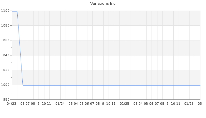 Date d'inscription : 29/04/23. Donateur pour EchecsEmail : Non ( Cliquez ici pour soutenir EchecsEmail. ) Elo non arrondi:958 ( 546 sur 441 joueurs ) Nombre de victoires :0 Nombre de nulles :0 Nombre de défaites :5 Temps de réponse moyen par coup : 0J 22H 20M 57S ( Moyenne sur 0 coups ). Rd ( Un petit rd indique un elo fiable ) : 188 Elo maximum atteint ( en étant classé ) :0 Elo maximum atteint cette année :0 Nombre coups joués : 99 Classement coupe : Inactif Points coupe : 0 Classement Coupe Magic Chess : Inactif Points Coupe Magic Chess : 0 Tournoi échelle : Nombre de tournois gagnés :0