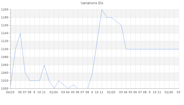 Date d'inscription : 19/11/22. Donateur pour EchecsEmail : Non ( Cliquez ici pour soutenir EchecsEmail. ) Elo non arrondi:1074.1 ( 475 sur 445 joueurs ) Nombre de victoires :67 Nombre de nulles :16 Nombre de défaites :265 Temps de réponse moyen par coup : 0J 19H 24M 14S ( Moyenne sur 3 coups ). Rd ( Un petit rd indique un elo fiable ) : 62 Elo maximum atteint ( en étant classé ) :1540 Elo maximum atteint cette année :0 Nombre coups joués : 10700 Classement coupe : Inactif Points coupe : 0 Classement Coupe Magic Chess : Inactif Points Coupe Magic Chess : 0 Tournoi échelle : Nombre de tournois gagnés :0