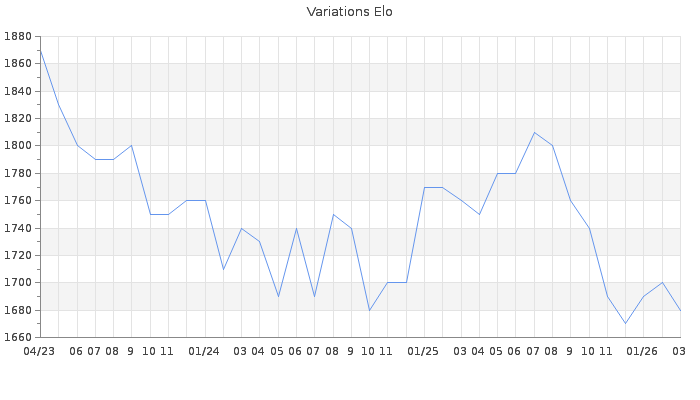 Date d'inscription : 26/08/18. Donateur pour EchecsEmail : Non ( Cliquez ici pour soutenir EchecsEmail. ) Elo non arrondi:1684.8 ( 277 sur 444 joueurs ) Nombre de victoires :312 Nombre de nulles :84 Nombre de défaites :330 Temps de réponse moyen par coup : 0J 5H 32M 26S ( Moyenne sur 744 coups ). Rd ( Un petit rd indique un elo fiable ) : 66 Magic Elo:1433.66 Magic Rd : 157 Elo maximum atteint ( en étant classé ) :1940 Elo maximum atteint cette année :1700 Nombre coups joués : 31966 Inscrit dans l' équipe:No Game No Life Classement coupe : Inactif, date de la dernière qualification : 29/05/22 Points coupe : 15.63 Classement Coupe Magic Chess : Inactif Points Coupe Magic Chess : 0 Tournoi échelle : Division 2 : 5 Tournois gagnés : 13/07/2024 : Cat 4 : Victoire CC Jan22 Asc 15/07/2019 : Cat 1 : Victoire CC Avr19 Asc 06/11/2018 : Cat 2 : Premier au tournoi multi Automne 2018 n°2 Nombre de tournois gagnés :3
