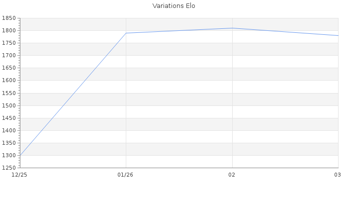 Date d'inscription : 29/12/25. Donateur pour EchecsEmail : Non ( Cliquez ici pour soutenir EchecsEmail. ) Elo non arrondi:1777.8 ( 230 sur 438 joueurs ) Nombre de victoires :19 Nombre de nulles :2 Nombre de défaites :8 Temps de réponse moyen par coup : 0J 16H 21M 17S ( Moyenne sur 622 coups ). Rd ( Un petit rd indique un elo fiable ) : 85 Elo maximum atteint ( en étant classé ) :1850 Elo maximum atteint cette année :1850 Nombre coups joués : 1134 Inscrit dans l' équipe:O fou d hello Classement coupe : Inactif Points coupe : 0 Classement Coupe Magic Chess : Inactif Points Coupe Magic Chess : 0 Tournoi échelle : Tournois gagnés : 14/02/2026 : Cat 1 : Victoire dans le tournoi n°27279 07/02/2026 : Cat 1 : Victoire dans le tournoi n°27358 20/01/2026 : Cat 0 : Victoire dans le tournoi n°27060 Nombre de tournois gagnés :3
