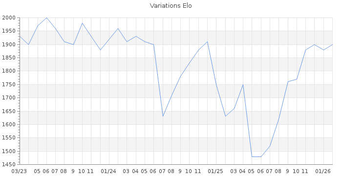 Date d'inscription : 01/02/07. Donateur pour EchecsEmail : Non ( Cliquez ici pour soutenir EchecsEmail. ) Elo non arrondi:1897.7 ( 185 sur 463 joueurs ) Nombre de victoires :3171 Nombre de nulles :684 Nombre de défaites :3094 Temps de réponse moyen par coup : 0J 19H 53M 28S ( Moyenne sur 4429 coups ). Rd ( Un petit rd indique un elo fiable ) : 56 Magic Elo:1294 Magic Rd : 206 Elo maximum atteint ( en étant classé ) :2210 Elo maximum atteint cette année :1930 Nombre coups joués : 228826 Classement coupe : Inactif Points coupe : 0 Classement Coupe Magic Chess : Inactif Points Coupe Magic Chess : 0 Tournoi échelle : Inactif. Tournois gagnés : 26/12/2025 : Cat 3 : Victoire dans le tournoi n°27196 15/12/2025 : Cat 3 : Victoire dans le tournoi n°27215 12/12/2025 : Cat 3 : Victoire dans le tournoi n°27190 03/12/2025 : Cat 2 : Victoire dans le tournoi n°26883 29/11/2025 : Cat 3 : Victoire dans le tournoi n°27022 23/11/2025 : Cat 2 : Victoire dans le tournoi n°26938 01/11/2025 : Cat 2 : Victoire dans le tournoi n°26821 09/10/2025 : Cat 2 : Victoire dans le tournoi n°26925 02/08/2025 : Cat 2 : Victoire dans le tournoi n°26752 22/11/2024 : Cat 3 : Victoire dans le tournoi n°25970 21/11/2024 : Cat 3 : Victoire dans le tournoi n°25971 22/07/2024 : Cat 4 : Victoire dans le tournoi n°25553 09/03/2024 : Cat 4 : Victoire dans le tournoi n°25188 18/01/2024 : Cat 4 : Victoire dans le tournoi n°25025 08/11/2023 : Cat 4 : Victoire dans le tournoi n°24888 18/10/2023 : Cat 4 : Victoire dans le tournoi n°24926 31/05/2023 : Cat 4 : Victoire dans le tournoi n°24585 30/03/2023 : Cat 4 : Victoire dans le tournoi n°24446 17/03/2023 : Cat 4 : Victoire dans le tournoi n°24313 20/01/2023 : Cat 4 : Victoire dans le tournoi n°24249 09/10/2022 : Cat 4 : Victoire dans le tournoi n°24054 21/09/2022 : Cat 4 : Victoire dans le tournoi n°23754 20/09/2022 : Cat 4 : Victoire dans le tournoi n°23773 04/09/2022 : Cat 4 : Victoire dans le tournoi n°23393 19/07/2022 : Cat 3 : Victoire dans le tournoi n°23153 09/07/2022 : Cat 4 : Victoire dans le tournoi n°23599 08/07/2022 : Cat 4 : Victoire dans le tournoi n°23724 28/05/2022 : Cat 3 : Victoire dans le tournoi n°23325 25/05/2022 : Cat 3 : Victoire dans le tournoi n°23297 23/04/2022 : Cat 4 : Victoire dans le tournoi n°23367 03/04/2022 : Cat 4 : Victoire dans le tournoi n°22476 21/12/2021 : Cat 3 : Victoire dans le tournoi n°23139 22/11/2021 : Cat 4 : Victoire dans le tournoi n°21830 05/11/2021 : Cat 3 : Victoire dans le tournoi n°23125 23/08/2021 : Cat 4 : Victoire dans le tournoi n°22187 11/07/2021 : Cat 4 : Victoire dans le tournoi n°22257 30/06/2021 : Cat 4 : Victoire dans le tournoi n°22389 24/06/2021 : Cat 4 : Victoire dans le tournoi n°21771 23/06/2021 : Cat 4 : Victoire dans le tournoi n°22292 14/05/2021 : Cat 4 : Victoire dans le tournoi n°21867 18/04/2021 : Cat 3 : Victoire dans le tournoi n°21693 30/11/2020 : Cat 3 : Victoire dans le tournoi n°21759 05/08/2020 : Cat 3 : Victoire dans le tournoi n°20847 19/05/2020 : Cat 3 : Victoire dans le tournoi n°20860 07/04/2020 : Cat 4 : Victoire dans le tournoi n°20040 21/03/2020 : Cat 4 : Victoire dans le tournoi n°20315 10/02/2020 : Cat 3 : Victoire dans le tournoi n°19891 13/12/2019 : Cat 3 : Victoire dans le tournoi n°19948 07/11/2019 : Cat 3 : Victoire dans le tournoi n°19960 18/10/2019 : Cat 4 : Victoire dans le tournoi n°19259 18/10/2019 : Cat 4 : Victoire dans le tournoi n°19595 15/06/2019 : Cat 4 : Victoire dans le tournoi n°19550 14/06/2019 : Cat 4 : Victoire dans le tournoi n°19698 06/06/2019 : Cat 4 : Victoire dans le tournoi n°19678 22/05/2019 : Cat 4 : Victoire dans le tournoi n°19649 18/05/2019 : Cat 4 : Victoire dans le tournoi n°19042 03/05/2019 : Cat 4 : Victoire dans le tournoi n°19581 21/04/2019 : Cat 4 : Victoire dans le tournoi n°19442 03/04/2019 : Cat 4 : Victoire dans le tournoi n°18820 13/03/2019 : Cat 4 : Victoire dans le tournoi n°18578 06/03/2019 : Cat 4 : Victoire dans le tournoi n°19304 27/02/2019 : Cat 4 : Victoire dans le tournoi n°19159 07/01/2019 : Cat 4 : Victoire dans le tournoi n°19083 22/12/2018 : Cat 4 : Victoire dans le tournoi n°19013 18/12/2018 : Cat 3 : Victoire dans le tournoi n°18993 17/12/2018 : Cat 3 : Victoire dans le tournoi n°19056 16/12/2018 : Cat 3 : Victoire dans le tournoi n°18962 17/11/2018 : Cat 3 : Victoire dans le tournoi n°18970 15/11/2018 : Cat 3 : Victoire dans le tournoi n°18958 13/11/2018 : Cat 3 : Victoire dans le tournoi n°18979 17/08/2018 : Cat 4 : Victoire dans le tournoi n°17943 06/08/2018 : Cat 4 : Victoire dans le tournoi n°18071 04/08/2018 : Cat 4 : Victoire dans le tournoi n°17999 02/08/2018 : Cat 4 : Victoire dans le tournoi n°18380 22/07/2018 : Cat 4 : Victoire dans le tournoi n°17974 25/06/2018 : Cat 4 : Victoire dans le tournoi n°17956 14/06/2018 : Cat 4 : Victoire dans le tournoi n°18035 09/06/2018 : Cat 4 : Victoire dans le tournoi n°17879 31/05/2018 : Cat 4 : Victoire dans le tournoi n°17830 26/05/2018 : Cat 4 : Victoire dans le tournoi n°17870 02/05/2018 : Cat 4 : Victoire dans le tournoi n°17802 23/04/2018 : Cat 4 : Victoire dans le tournoi n°17819 17/04/2018 : Cat 3 : Victoire dans le tournoi n°17464 11/04/2018 : Cat 4 : Victoire dans le tournoi n°17760 16/03/2018 : Cat 4 : Victoire dans le tournoi n°17667 08/03/2018 : Cat 4 : Victoire dans le tournoi n°17796 21/02/2018 : Cat 4 : Victoire dans le tournoi n°17549 15/02/2018 : Cat 3 : Victoire dans le tournoi n°17597 13/02/2018 : Cat 4 : Victoire dans le tournoi n°17516 02/02/2018 : Cat 4 : Victoire dans le tournoi n°17459 10/01/2018 : Cat 3 : Victoire dans le tournoi n°17445 07/01/2018 : Cat 3 : Victoire dans le tournoi n°17430 06/01/2018 : Cat 3 : Victoire dans le tournoi n°17365 03/11/2017 : Cat 4 : Victoire dans le tournoi n°16640 30/04/2017 : Cat 3 : Victoire dans le tournoi n°15238 22/03/2017 : Cat 4 : Victoire dans le tournoi n°15941 12/03/2017 : Cat 4 : Victoire dans le tournoi n°15282 01/03/201
