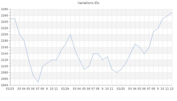Date d'inscription : 16/03/11. Donateur pour EchecsEmail : Non ( Cliquez ici pour soutenir EchecsEmail. ) Elo non arrondi:2269.2 ( 44 sur 449 joueurs ) Nombre de victoires :453 Nombre de nulles :99 Nombre de défaites :302 Temps de réponse moyen par coup : 0J 10H 44M 6S ( Moyenne sur 426 coups ). Rd ( Un petit rd indique un elo fiable ) : 76 Elo maximum atteint ( en étant classé ) :2360 Elo maximum atteint cette année :2270 Nombre coups joués : 28221 Inscrit dans l' équipe:Les enfants de l Atlantide Classement coupe : Inactif Points coupe : 0.03 Classement Coupe Magic Chess : Inactif Points Coupe Magic Chess : 0 Tournoi échelle : Inactif. Tournois gagnés : 04/11/2025 : Cat 5 : Victoire dans le tournoi n°27149 18/09/2018 : Cat 6 : Victoire dans le tournoi n°18659 02/05/2018 : Cat 4 : Victoire dans le tournoi n°17744 12/01/2017 : Cat 4 : Victoire dans le tournoi n°15703 30/09/2014 : Cat 5 : Victoire dans le tournoi n°15975 03/09/2011 : Cat 5 : Victoire dans le tournoi n°8997 21/05/2011 : Cat 4 : Victoire dans le tournoi n°8632 Nombre de tournois gagnés :7