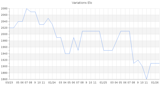 Date d'inscription : 15/10/11. Donateur pour EchecsEmail : Non ( Cliquez ici pour soutenir EchecsEmail. ) Elo non arrondi:1905.3 ( 180 sur 461 joueurs ) Nombre de victoires :259 Nombre de nulles :30 Nombre de défaites :111 Temps de réponse moyen par coup : 0J 9H 12M 43S ( Moyenne sur 172 coups ). Rd ( Un petit rd indique un elo fiable ) : 81 Magic Elo:1700 Magic Rd : 350 Elo maximum atteint ( en étant classé ) :2180 Elo maximum atteint cette année :0 Nombre coups joués : 15499 Inscrit dans l' équipe:Fair play Classement coupe : Inactif Points coupe : 0 Classement Coupe Magic Chess : Inactif Points Coupe Magic Chess : 0 Tournoi échelle : Inactif. Tournois gagnés : 27/08/2024 : Cat 4 : Victoire dans le tournoi n°25973 05/10/2022 : Cat 4 : Victoire dans le tournoi n°24267 24/04/2022 : Cat 4 : Victoire dans le tournoi n°23832 11/10/2020 : Cat 4 : Victoire dans le tournoi n°21798 19/11/2015 : Cat 4 : Victoire dans le tournoi n°18500 02/03/2015 : Cat 4 : Victoire dans le tournoi n°17113 28/08/2014 : Cat 4 : Victoire dans le tournoi n°15862 31/03/2014 : Cat 4 : Victoire dans le tournoi n°14663 19/01/2014 : Cat 3 : Victoire dans le tournoi n°14417 Nombre de tournois gagnés :9