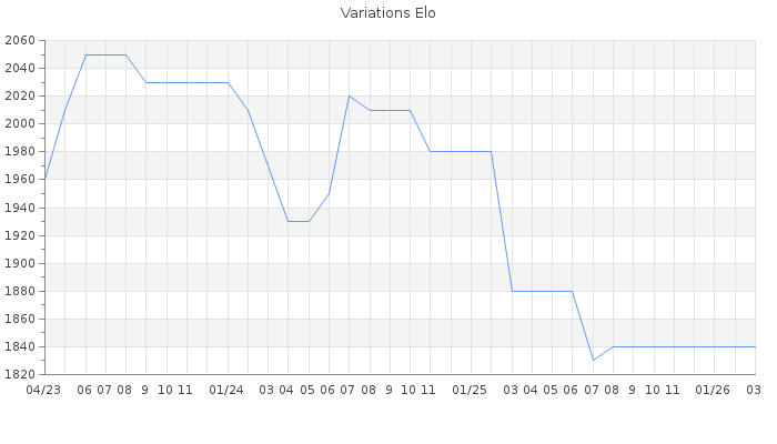 Date d'inscription : 29/06/21. Donateur pour EchecsEmail : Non ( Cliquez ici pour soutenir EchecsEmail. ) Elo non arrondi:1829.9 ( 217 sur 440 joueurs ) Nombre de victoires :42 Nombre de nulles :5 Nombre de défaites :30 Temps de réponse moyen par coup : 0J 5H 17M 26S ( Moyenne sur 4 coups ). Rd ( Un petit rd indique un elo fiable ) : 105 Magic Elo:1700 Magic Rd : 350 Elo maximum atteint ( en étant classé ) :2070 Elo maximum atteint cette année :0 Nombre coups joués : 2862 Classement coupe : Inactif Points coupe : 0 Classement Coupe Magic Chess : Inactif Points Coupe Magic Chess : 0 Tournoi échelle : Inactif. Tournois gagnés : 19/12/2024 : Cat 4 : Victoire dans le tournoi n°25909 09/07/2024 : Cat 4 : Premier au tournoi multi Eté 2024 n°4 29/07/2023 : Cat 4 : Premier au tournoi multi Eté 2023 n°3 21/04/2023 : Cat 4 : Victoire dans le tournoi n°24792 17/11/2021 : Cat 4 : Premier au tournoi multi Automne 2021 n°3 27/08/2021 : Cat 3 : Victoire dans le tournoi n°23075 13/08/2021 : Cat 0 : Victoire dans le tournoi n°22935 30/07/2021 : Cat 1 : Victoire dans le tournoi n°22945 Nombre de tournois gagnés :11