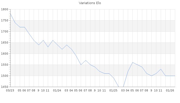 Date d'inscription : 06/10/13. Donateur pour EchecsEmail : Non ( Cliquez ici pour soutenir EchecsEmail. ) Elo non arrondi:1495.3 ( 375 sur 459 joueurs ) Nombre de victoires :335 Nombre de nulles :26 Nombre de défaites :611 Temps de réponse moyen par coup : 0J 18H 24M 34S ( Moyenne sur 259 coups ). Rd ( Un petit rd indique un elo fiable ) : 88 Magic Elo:1600 Magic Rd : 350 Elo maximum atteint ( en étant classé ) :1910 Elo maximum atteint cette année :1500 Nombre coups joués : 38539 Inscrit dans l' équipe:fouschess Classement coupe : Inactif Points coupe : 0 Classement Coupe Magic Chess : Inactif Points Coupe Magic Chess : 0 Tournoi échelle : Nombre de tournois gagnés :0