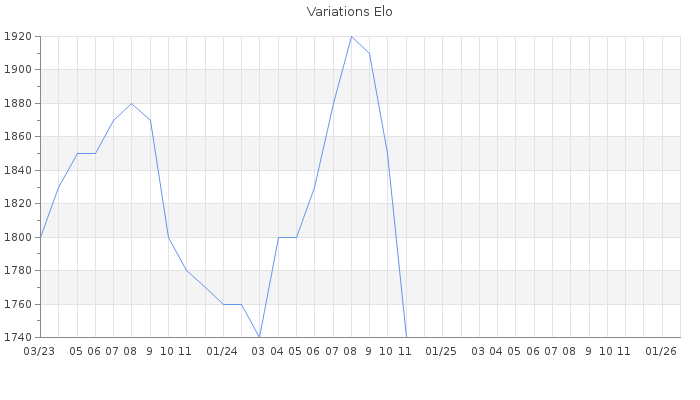 Date d'inscription : 25/05/18. Donateur pour EchecsEmail : Non ( Cliquez ici pour soutenir EchecsEmail. ) Elo non arrondi:1715.7 ( 287 sur 461 joueurs ) Nombre de victoires :111 Nombre de nulles :8 Nombre de défaites :55 Temps de réponse moyen par coup : 0J 23H 23M 47S ( Moyenne sur 0 coups ). Rd ( Un petit rd indique un elo fiable ) : 81 Magic Elo:1600 Magic Rd : 350 Elo maximum atteint ( en étant classé ) :1950 Elo maximum atteint cette année :0 Nombre coups joués : 6319 Classement coupe : Inactif Points coupe : 0 Classement Coupe Magic Chess : Inactif Points Coupe Magic Chess : 0 Tournoi échelle : Inactif. Tournois gagnés : 28/06/2024 : Cat 3 : Victoire dans le tournoi n°25713 01/02/2022 : Cat 3 : Victoire dans le tournoi n°23567 01/01/2019 : Cat 2 : Victoire dans le tournoi n°18896 20/11/2018 : Cat 2 : Victoire dans le tournoi n°18880 05/08/2018 : Cat 3 : Victoire dans le tournoi n°18414 28/07/2018 : Cat 3 : Victoire dans le tournoi n°18394 10/07/2018 : Cat 0 : Victoire dans le tournoi n°18192 04/07/2018 : Cat 1 : Victoire dans le tournoi n°18225 Nombre de tournois gagnés :8