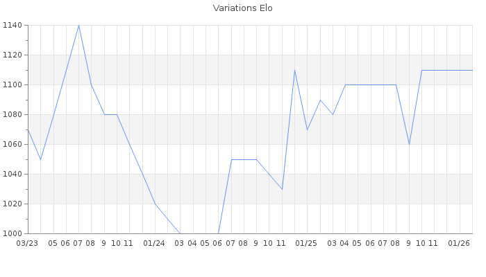 Date d'inscription : 19/04/21. Donateur pour EchecsEmail : Non ( Cliquez ici pour soutenir EchecsEmail. ) Elo non arrondi:1106.5 ( 450 sur 459 joueurs ) Nombre de victoires :46 Nombre de nulles :5 Nombre de défaites :123 Temps de réponse moyen par coup : 0J 9H 29M 5S ( Moyenne sur 107 coups ). Rd ( Un petit rd indique un elo fiable ) : 117 Elo maximum atteint ( en étant classé ) :1180 Elo maximum atteint cette année :0 Nombre coups joués : 8721 Classement coupe : Inactif Points coupe : 0 Classement Coupe Magic Chess : Inactif Points Coupe Magic Chess : 0 Tournoi échelle : Nombre de tournois gagnés :0