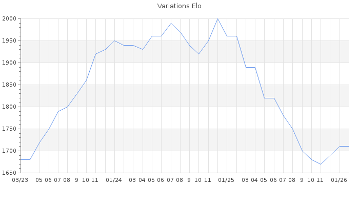 Date d'inscription : 05/05/11. Donateur pour EchecsEmail : Non ( Cliquez ici pour soutenir EchecsEmail. ) Elo non arrondi:1707.3 ( 272 sur 459 joueurs ) Nombre de victoires :328 Nombre de nulles :72 Nombre de défaites :212 Temps de réponse moyen par coup : 1J 7H 57M 6S ( Moyenne sur 204 coups ). Rd ( Un petit rd indique un elo fiable ) : 83 Magic Elo:1600 Magic Rd : 350 Elo maximum atteint ( en étant classé ) :2000 Elo maximum atteint cette année :1710 Nombre coups joués : 19662 Classement coupe : Inactif Points coupe : 0 Classement Coupe Magic Chess : Inactif Points Coupe Magic Chess : 0 Tournoi échelle : Inactif. Tournois gagnés : 16/09/2024 : Cat 4 : Victoire dans le tournoi n°25802 08/06/2024 : Cat 4 : Victoire dans le tournoi n°25413 27/01/2024 : Cat 3 : Victoire dans le tournoi n°25355 31/12/2023 : Cat 3 : Victoire dans le tournoi n°25203 01/10/2023 : Cat 3 : Victoire dans le tournoi n°25123 09/08/2023 : Cat 2 : Victoire dans le tournoi n°24928 21/05/2023 : Cat 2 : Victoire dans le tournoi n°24768 07/01/2023 : Cat 3 : Victoire dans le tournoi n°24157 06/03/2022 : Cat 2 : Victoire dans le tournoi n°23539 20/02/2022 : Cat 1 : Victoire dans le tournoi n°23503 26/01/2022 : Cat 2 : Victoire dans le tournoi n°23516 10/01/2022 : Cat 1 : Victoire dans le tournoi n°23465 29/12/2021 : Cat 1 : Victoire dans le tournoi n°23395 23/12/2021 : Cat 1 : Victoire dans le tournoi n°23329 11/11/2021 : Cat 1 : Victoire dans le tournoi n°23250 06/08/2018 : Cat 2 : Victoire dans le tournoi n°18499 11/04/2018 : Cat 1 : Victoire dans le tournoi n°17367 05/01/2018 : Cat 1 : Victoire dans le tournoi n°17396 Nombre de tournois gagnés :18