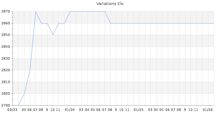 Date d'inscription : 31/07/22. Donateur pour EchecsEmail : Non ( Cliquez ici pour soutenir EchecsEmail. ) Elo non arrondi:2836.7 ( 6 sur 463 joueurs ) Nombre de victoires :168 Nombre de nulles :56 Nombre de défaites :1 Temps de réponse moyen par coup : 0J 9H 20M 54S ( Moyenne sur 0 coups ). Rd ( Un petit rd indique un elo fiable ) : 103 Magic Elo:1700 Magic Rd : 350 Elo maximum atteint ( en étant classé ) :2880 Elo maximum atteint cette année :0 Nombre coups joués : 6065 Classement coupe : Inactif, date de la dernière qualification : 16/08/23 Points coupe : 726.59 Classement Coupe Magic Chess : Inactif Points Coupe Magic Chess : 0 Tournoi échelle : Inactif. Tournois gagnés : 18/07/2023 : Cat 9 : Victoire CC Hiver 2023 21/06/2023 : Cat 6 : Premier au tournoi multi Saint-Valentin 2023 n°1 22/03/2023 : Cat 6 : Victoire CC Fev23 14/03/2023 : Cat 7 : Victoire CC Dec22 13/03/2023 : Cat 5 : Premier au tournoi multi Saint-Valentin 2023 n°3 01/02/2023 : Cat 7 : Premier au tournoi multi Halloween 2022 n°1 03/01/2023 : Cat 7 : Premier au tournoi multi Automne 2022 n°1 30/12/2022 : Cat 5 : Premier au tournoi multi Noël 2022 n°3 19/11/2022 : Cat 5 : Premier au tournoi multi Halloween 2022 n°3 29/09/2022 : Cat 4 : Premier au tournoi multi Automne 2022 n°3 Nombre de tournois gagnés :17