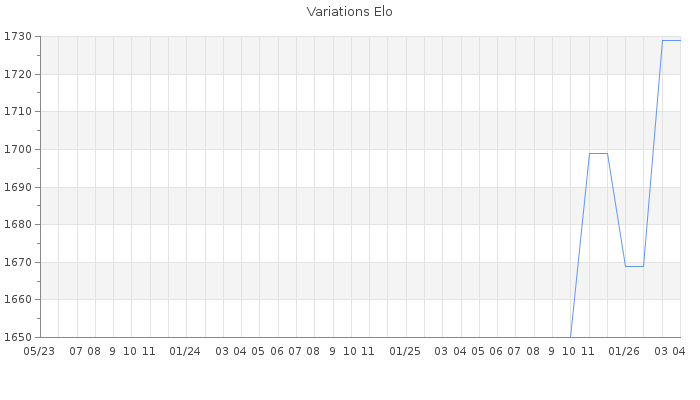 Date d'inscription : 08/09/13. Donateur pour EchecsEmail : Oui ( Cliquez ici pour soutenir EchecsEmail. ) Elo non arrondi:1730.1 ( 254 sur 446 joueurs ) Nombre de victoires :1947 Nombre de nulles :225 Nombre de défaites :1594 Temps de réponse moyen par coup : 0J 5H 42M 33S ( Moyenne sur 38 coups ). Rd ( Un petit rd indique un elo fiable ) : 164 Magic Elo:1600 Magic Rd : 350 Elo maximum atteint ( en étant classé ) :1830 Elo maximum atteint cette année :0 Nombre coups joués : 121235 Classement coupe : Inactif Points coupe : 2.6 Classement Coupe Magic Chess : Inactif Points Coupe Magic Chess : 0 Tournoi échelle : Inactif. Tournois gagnés : 05/05/2021 : Cat 3 : Victoire dans le tournoi n°22563 07/03/2021 : Cat 3 : Victoire dans le tournoi n°22434 21/12/2020 : Cat 3 : Victoire dans le tournoi n°21998 04/11/2020 : Cat 3 : Victoire dans le tournoi n°21913 12/10/2020 : Cat 3 : Victoire dans le tournoi n°21850 11/10/2020 : Cat 3 : Victoire dans le tournoi n°21869 28/09/2020 : Cat 3 : Victoire dans le tournoi n°21776 28/09/2020 : Cat 3 : Victoire dans le tournoi n°21800 22/09/2020 : Cat 3 : Victoire dans le tournoi n°21723 04/04/2020 : Cat 3 : Victoire dans le tournoi n°20958 21/03/2020 : Cat 3 : Victoire dans le tournoi n°20930 07/03/2020 : Cat 3 : Victoire dans le tournoi n°20741 06/03/2020 : Cat 3 : Victoire dans le tournoi n°20881 04/03/2020 : Cat 3 : Victoire dans le tournoi n°20830 20/12/2019 : Cat 3 : Victoire dans le tournoi n°20438 06/11/2019 : Cat 2 : Victoire dans le tournoi n°20246 19/10/2019 : Cat 2 : Victoire dans le tournoi n°20195 15/10/2019 : Cat 3 : Victoire dans le tournoi n°20290 15/10/2019 : Cat 2 : Victoire dans le tournoi n°20114 15/10/2019 : Cat 2 : Victoire dans le tournoi n°20244 14/10/2019 : Cat 2 : Victoire dans le tournoi n°20284 14/10/2019 : Cat 2 : Victoire dans le tournoi n°20240 10/10/2019 : Cat 2 : Victoire dans le tournoi n°20273 09/10/2019 : Cat 2 : Victoire dans le tournoi n°20225 17/09/2019 : Cat 2 : Victoire dans le tournoi n°20090 14/09/2019 : Cat 2 : Victoire dans le tournoi n°20088 11/09/2019 : Cat 2 : Victoire dans le tournoi n°20025 23/08/2019 : Cat 2 : Victoire dans le tournoi n°19951 21/08/2019 : Cat 2 : Victoire dans le tournoi n°19940 14/08/2019 : Cat 2 : Victoire dans le tournoi n°19973 05/08/2019 : Cat 3 : Victoire dans le tournoi n°19995 10/07/2019 : Cat 2 : Victoire dans le tournoi n°19855 26/02/2019 : Cat 3 : Victoire dans le tournoi n°19375 04/02/2019 : Cat 2 : Victoire dans le tournoi n°19227 23/01/2019 : Cat 2 : Victoire dans le tournoi n°19208 17/01/2019 : Cat 2 : Victoire dans le tournoi n°19179 13/01/2019 : Cat 2 : Premier au tournoi multi Noël 2018 n°4 07/01/2019 : Cat 2 : Victoire dans le tournoi n°19150 14/12/2018 : Cat 2 : Victoire dans le tournoi n°19000 06/07/2018 : Cat 2 : Victoire dans le tournoi n°18318 02/07/2018 : Cat 2 : Victoire dans le tournoi n°18346 23/06/2018 : Cat 3 : Victoire dans le tournoi n°18263 17/06/2018 : Cat 2 : Victoire dans le tournoi n°18218 29/03/2018 : Cat 2 : Victoire dans le tournoi n°17938 28/03/2018 : Cat 2 : Victoire dans le tournoi n°17893 27/03/2018 : Cat 2 : Victoire dans le tournoi n°17892 26/03/2018 : Cat 2 : Victoire dans le tournoi n°17615 18/03/2018 : Cat 2 : Victoire dans le tournoi n°17847 22/02/2018 : Cat 2 : Victoire dans le tournoi n°17690 15/02/2018 : Cat 2 : Victoire dans le tournoi n°17630 24/01/2018 : Cat 2 : Victoire dans le tournoi n°17564 21/11/2017 : Cat 2 : Victoire dans le tournoi n°17222 08/11/2017 : Cat 2 : Victoire dans le tournoi n°17295 06/11/2017 : Cat 2 : Victoire dans le tournoi n°17027 05/11/2017 : Cat 2 : Victoire dans le tournoi n°17259 02/11/2017 : Cat 2 : Victoire dans le tournoi n°17240 25/10/2017 : Cat 2 : Victoire dans le tournoi n°16816 21/10/2017 : Cat 2 : Victoire dans le tournoi n°17194 17/10/2017 : Cat 2 : Victoire dans le tournoi n°17205 11/10/2017 : Cat 2 : Victoire dans le tournoi n°17041 04/10/2017 : Cat 2 : Victoire dans le tournoi n°17089 01/10/2017 : Cat 2 : Victoire dans le tournoi n°16931 28/09/2017 : Cat 2 : Victoire dans le tournoi n°17110 24/09/2017 : Cat 2 : Victoire dans le tournoi n°17037 27/06/2017 : Cat 2 : Victoire dans le tournoi n°16688 25/06/2017 : Cat 2 : Victoire dans le tournoi n°16699 08/06/2017 : Cat 2 : Victoire dans le tournoi n°16580 07/06/2017 : Cat 2 : Victoire dans le tournoi n°16576 03/06/2017 : Cat 2 : Victoire dans le tournoi n°16587 08/05/2017 : Cat 2 : Victoire dans le tournoi n°16511 14/03/2017 : Cat 1 : Victoire dans le tournoi n°16308 09/03/2017 : Cat 1 : Victoire dans le tournoi n°16262 25/10/2016 : Cat 2 : Victoire dans le tournoi n°15483 20/10/2016 : Cat 2 : Victoire dans le tournoi n°15454 18/10/2016 : Cat 0 : Premier au tournoi multi Automne 2016 n°6 13/10/2016 : Cat 2 : Victoire dans le tournoi n°15375 11/10/2016 : Cat 2 : Victoire dans le tournoi n°15513 09/10/2016 : Cat 2 : Victoire dans le tournoi n°15321 22/09/2016 : Cat 2 : Victoire dans le tournoi n°15429 14/09/2016 : Cat 2 : Victoire dans le tournoi n°15342 09/09/2016 : Cat 2 : Victoire dans le tournoi n°15099 04/08/2016 : Cat 2 : Victoire dans le tournoi n°15031 25/07/2016 : Cat 0 : Premier au tournoi multi Eté 2016 n°6 22/06/2016 : Cat 2 : Victoire dans le tournoi n°14908 25/04/2016 : Cat 1 : Victoire dans le tournoi n°14613 20/03/2016 : Cat 1 : Victoire dans le tournoi n°14469 17/03/2016 : Cat 1 : Victoire dans le tournoi n°14430 03/03/2015 : Cat 3 : Victoire dans le tournoi n°17121 07/02/2015 : Cat 2 : Victoire dans le tournoi n°16794 23/01/2015 : Cat 2 : Victoire dans le tournoi n°16773 17/01/2015 : Cat 0 : Premier au tournoi multi Noël 2014 n°2 30/12/2014 : Cat 2 : Victoire dans le tournoi n°16531 27/11/2014 : Cat 2 : Victoire dans le tournoi n°16468 28/09/2014 : Cat 2 : Victoire dans le tournoi n°15960 16/09/2014 : Cat 2 : Victoire dans le tournoi n°15762 15/09/2014 : Cat 2 : Victoire dans le tournoi n°15940 21/08/2014 : Cat 2 : Victoire dans le 