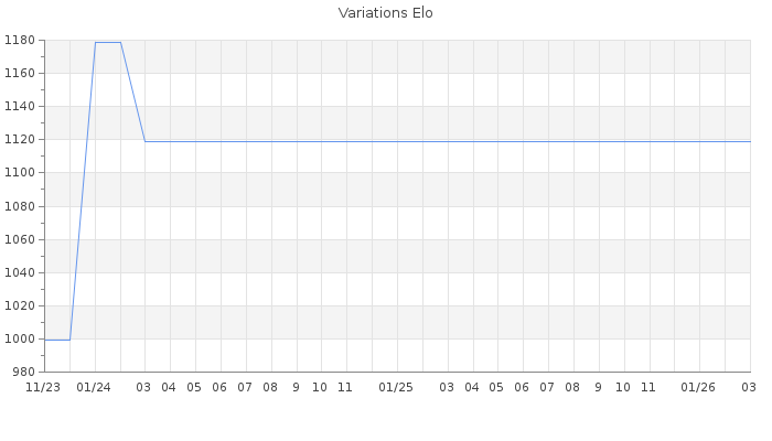 Date d'inscription : 26/11/23. Donateur pour EchecsEmail : Non ( Cliquez ici pour soutenir EchecsEmail. ) Elo non arrondi:1081.4 ( 494 sur 438 joueurs ) Nombre de victoires :1 Nombre de nulles :0 Nombre de défaites :1 Temps de réponse moyen par coup : 0J 23H 49M 19S ( Moyenne sur 0 coups ). Rd ( Un petit rd indique un elo fiable ) : 220 Elo maximum atteint ( en étant classé ) :0 Elo maximum atteint cette année :0 Nombre coups joués : 73 Classement coupe : Inactif Points coupe : 0 Classement Coupe Magic Chess : Inactif Points Coupe Magic Chess : 0 Tournoi échelle : Nombre de tournois gagnés :0