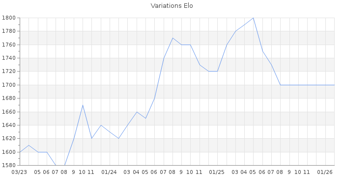 Date d'inscription : 04/11/19. Donateur pour EchecsEmail : Non ( Cliquez ici pour soutenir EchecsEmail. ) Elo non arrondi:1692.2 ( 278 sur 459 joueurs ) Nombre de victoires :147 Nombre de nulles :22 Nombre de défaites :226 Temps de réponse moyen par coup : 0J 8H 51M 59S ( Moyenne sur 17 coups ). Rd ( Un petit rd indique un elo fiable ) : 80 Magic Elo:1700 Magic Rd : 350 Elo maximum atteint ( en étant classé ) :1820 Elo maximum atteint cette année :0 Nombre coups joués : 16514 Classement coupe : Inactif, date de la dernière qualification : 16/08/24 Points coupe : 0.93 Classement Coupe Magic Chess : Inactif Points Coupe Magic Chess : 0 Tournoi échelle : Inactif. Tournois gagnés : 14/03/2025 : Cat 3 : Victoire dans le tournoi n°26532 27/12/2023 : Cat 2 : Victoire dans le tournoi n°25458 08/10/2023 : Cat 2 : Victoire dans le tournoi n°25247 06/03/2023 : Cat 2 : Victoire dans le tournoi n°24630 24/01/2023 : Cat 2 : Victoire dans le tournoi n°24545 22/09/2022 : Cat 2 : Victoire dans le tournoi n°24231 18/08/2022 : Cat 2 : Victoire dans le tournoi n°24116 16/01/2022 : Cat 1 : Victoire dans le tournoi n°23293 Nombre de tournois gagnés :8