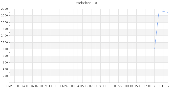 Date d'inscription : 09/08/13. Donateur pour EchecsEmail : Non ( Cliquez ici pour soutenir EchecsEmail. ) Elo non arrondi:2090 ( 86 sur 448 joueurs ) Nombre de victoires :38 Nombre de nulles :4 Nombre de défaites :50 Temps de réponse moyen par coup : 0J 3H 6M 12S ( Moyenne sur 984 coups ). Rd ( Un petit rd indique un elo fiable ) : 61 Magic Elo:1700 Magic Rd : 350 Elo maximum atteint ( en étant classé ) :2180 Elo maximum atteint cette année :2180 Nombre coups joués : 2109 Inscrit dans l' équipe:Fair play Classement coupe : 117 Points coupe : 43.32 Classement Coupe Magic Chess : Inactif Points Coupe Magic Chess : 0 Tournoi échelle : Inactif. Tournois gagnés : 10/11/2025 : Cat 4 : Premier au tournoi multi Halloween 2025 n°4 02/11/2025 : Cat 5 : Victoire dans le tournoi n°27159 14/10/2025 : Cat 2 : Victoire dans le tournoi n°27121 Nombre de tournois gagnés :4