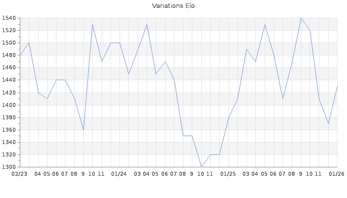 Date d'inscription : 22/02/21. Donateur pour EchecsEmail : Non ( Cliquez ici pour soutenir EchecsEmail. ) Elo non arrondi:1430.8 ( 400 sur 462 joueurs ) Nombre de victoires :383 Nombre de nulles :47 Nombre de défaites :597 Temps de réponse moyen par coup : 0J 18H 2M 28S ( Moyenne sur 916 coups ). Rd ( Un petit rd indique un elo fiable ) : 53 Elo maximum atteint ( en étant classé ) :1670 Elo maximum atteint cette année :1430 Nombre coups joués : 28564 Inscrit dans l' équipe:O fou d hello Classement coupe : Inactif Points coupe : 0 Classement Coupe Magic Chess : Inactif Points Coupe Magic Chess : 0 Tournoi échelle : Inactif. Tournois gagnés : 17/10/2025 : Cat 2 : Victoire dans le tournoi n°27032 12/02/2025 : Cat 1 : Victoire dans le tournoi n°26139 07/12/2024 : Cat 1 : Victoire dans le tournoi n°26179 15/04/2024 : Cat 1 : Victoire dans le tournoi n°25705 08/12/2023 : Cat 1 : Victoire dans le tournoi n°25225 15/10/2023 : Cat 1 : Victoire dans le tournoi n°25098 05/10/2023 : Cat 1 : Victoire dans le tournoi n°25071 27/03/2023 : Cat 1 : Victoire dans le tournoi n°24725 19/09/2022 : Cat 1 : Victoire dans le tournoi n°24212 19/10/2021 : Cat 2 : Victoire dans le tournoi n°23191 Nombre de tournois gagnés :10