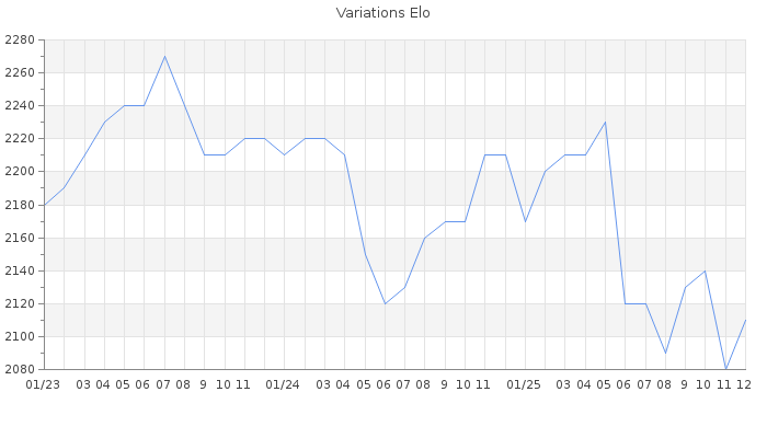 Date d'inscription : 15/05/10. Donateur pour EchecsEmail : Non ( Cliquez ici pour soutenir EchecsEmail. ) Elo non arrondi:2106.3 ( 85 sur 458 joueurs ) Nombre de victoires :811 Nombre de nulles :161 Nombre de défaites :476 Temps de réponse moyen par coup : 1J 1H 40M 11S ( Moyenne sur 539 coups ). Rd ( Un petit rd indique un elo fiable ) : 70 Magic Elo:1989.27 Magic Rd : 103 Elo maximum atteint ( en étant classé ) :2410 Elo maximum atteint cette année :2240 Nombre coups joués : 43943 Inscrit dans l' équipe:Pirates du Mat Classement coupe : Inactif Points coupe : 0 Classement Coupe Magic Chess : Inactif Points Coupe Magic Chess : 0 Tournoi échelle : Inactif. Tournois gagnés : 23/11/2015 : Cat 5 : Victoire dans le tournoi n°18656 14/11/2015 : Cat 5 : Victoire dans le tournoi n°18634 20/10/2014 : Cat 5 : Victoire dans le tournoi n°15997 07/01/2014 : Cat 5 : Victoire dans le tournoi n°13925 05/04/2013 : Cat 5 : Victoire dans le tournoi n°11877 25/03/2012 : Cat 5 : Victoire dans le tournoi n°9963 06/10/2011 : Cat 5 : Victoire dans le tournoi n°8708 18/07/2011 : Cat 5 : Victoire dans le tournoi n°8745 23/11/2010 : Cat 5 : Victoire dans le tournoi n°7967 13/11/2010 : Cat 5 : Victoire dans le tournoi n°7952 Nombre de tournois gagnés :10