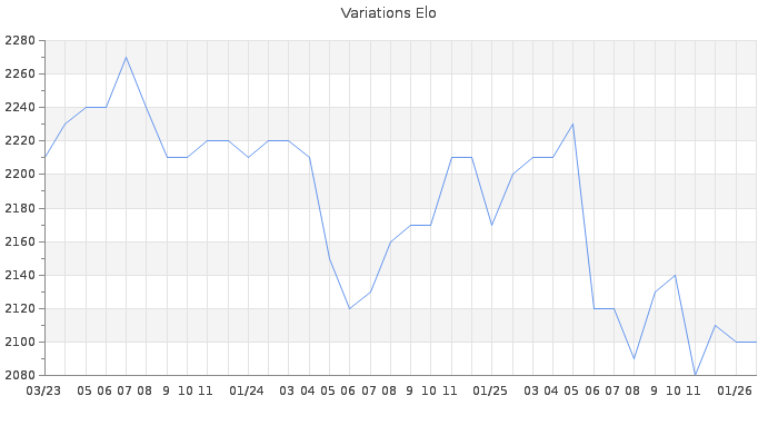 Date d'inscription : 15/05/10. Donateur pour EchecsEmail : Non ( Cliquez ici pour soutenir EchecsEmail. ) Elo non arrondi:2103.9 ( 90 sur 461 joueurs ) Nombre de victoires :812 Nombre de nulles :161 Nombre de défaites :476 Temps de réponse moyen par coup : 1J 1H 31M 26S ( Moyenne sur 268 coups ). Rd ( Un petit rd indique un elo fiable ) : 77 Magic Elo:1989.27 Magic Rd : 103 Elo maximum atteint ( en étant classé ) :2410 Elo maximum atteint cette année :2100 Nombre coups joués : 43954 Inscrit dans l' équipe:Pirates du Mat Classement coupe : Inactif Points coupe : 0 Classement Coupe Magic Chess : Inactif Points Coupe Magic Chess : 0 Tournoi échelle : Inactif. Tournois gagnés : 23/11/2015 : Cat 5 : Victoire dans le tournoi n°18656 14/11/2015 : Cat 5 : Victoire dans le tournoi n°18634 20/10/2014 : Cat 5 : Victoire dans le tournoi n°15997 07/01/2014 : Cat 5 : Victoire dans le tournoi n°13925 05/04/2013 : Cat 5 : Victoire dans le tournoi n°11877 25/03/2012 : Cat 5 : Victoire dans le tournoi n°9963 06/10/2011 : Cat 5 : Victoire dans le tournoi n°8708 18/07/2011 : Cat 5 : Victoire dans le tournoi n°8745 23/11/2010 : Cat 5 : Victoire dans le tournoi n°7967 13/11/2010 : Cat 5 : Victoire dans le tournoi n°7952 Nombre de tournois gagnés :10