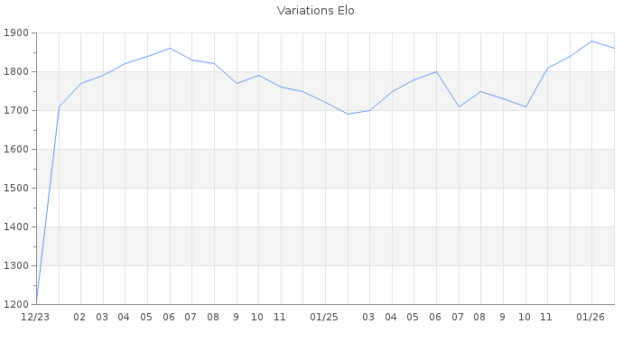 Date d'inscription : 11/12/23. Donateur pour EchecsEmail : Non ( Cliquez ici pour soutenir EchecsEmail. ) Elo non arrondi:1861.9 ( 200 sur 454 joueurs ) Nombre de victoires :199 Nombre de nulles :43 Nombre de défaites :123 Temps de réponse moyen par coup : 0J 7H 39M 46S ( Moyenne sur 1432 coups ). Rd ( Un petit rd indique un elo fiable ) : 59 Magic Elo:1700 Magic Rd : 350 Elo maximum atteint ( en étant classé ) :1890 Elo maximum atteint cette année :1890 Nombre coups joués : 13350 Inscrit dans l' équipe:La Diagonale du Fou Classement coupe : Inactif Points coupe : 0 Classement Coupe Magic Chess : Inactif Points Coupe Magic Chess : 0 Tournoi échelle : Tournois gagnés : 20/02/2024 : Cat 1 : Victoire dans le tournoi n°25461 Nombre de tournois gagnés :1