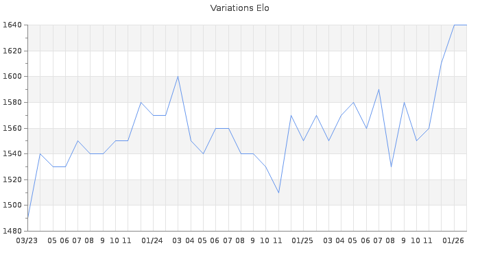 Date d'inscription : 20/01/13. Donateur pour EchecsEmail : Non ( Cliquez ici pour soutenir EchecsEmail. ) Elo non arrondi:1637.7 ( 313 sur 458 joueurs ) Nombre de victoires :1099 Nombre de nulles :75 Nombre de défaites :1634 Temps de réponse moyen par coup : 0J 3H 16M 37S ( Moyenne sur 819 coups ). Rd ( Un petit rd indique un elo fiable ) : 56 Magic Elo:1700 Magic Rd : 350 Elo maximum atteint ( en étant classé ) :1650 Elo maximum atteint cette année :1650 Nombre coups joués : 104770 Classement coupe : Inactif Points coupe : 0 Classement Coupe Magic Chess : Inactif Points Coupe Magic Chess : 0 Tournoi échelle : Inactif. Nombre de tournois gagnés :0