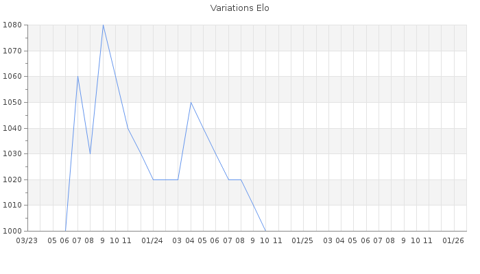 Date d'inscription : 11/09/20. Donateur pour EchecsEmail : Non ( Cliquez ici pour soutenir EchecsEmail. ) Elo non arrondi:995 ( 460 sur 454 joueurs ) Nombre de victoires :7 Nombre de nulles :3 Nombre de défaites :215 Temps de réponse moyen par coup : 1J 23H 48M 45S ( Moyenne sur 12 coups ). Rd ( Un petit rd indique un elo fiable ) : 133 Elo maximum atteint ( en étant classé ) :1090 Elo maximum atteint cette année :0 Nombre coups joués : 5326 Classement coupe : Inactif Points coupe : 0 Classement Coupe Magic Chess : Inactif Points Coupe Magic Chess : 0 Tournoi échelle : Nombre de tournois gagnés :0