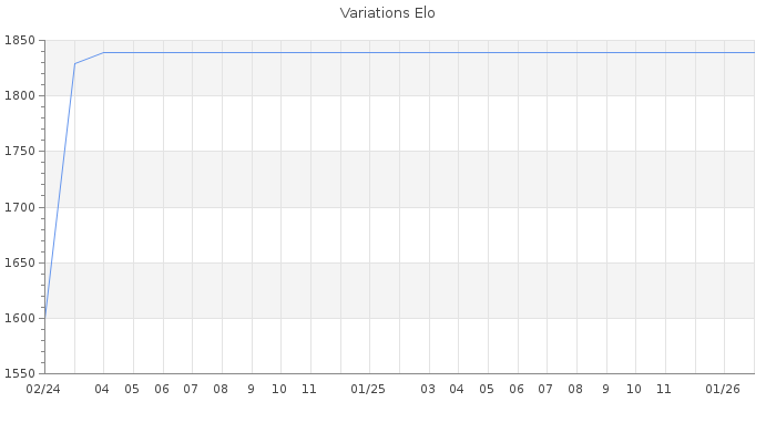 Date d'inscription : 26/02/24. Donateur pour EchecsEmail : Non ( Cliquez ici pour soutenir EchecsEmail. ) Elo non arrondi:1808.7 ( 236 sur 454 joueurs ) Nombre de victoires :2 Nombre de nulles :0 Nombre de défaites :0 Temps de réponse moyen par coup : 0J 3H 14M 3S ( Moyenne sur 0 coups ). Rd ( Un petit rd indique un elo fiable ) : 243 Elo maximum atteint ( en étant classé ) :0 Elo maximum atteint cette année :0 Nombre coups joués : 52 Classement coupe : Inactif Points coupe : 0 Classement Coupe Magic Chess : Inactif Points Coupe Magic Chess : 0 Tournoi échelle : Nombre de tournois gagnés :0