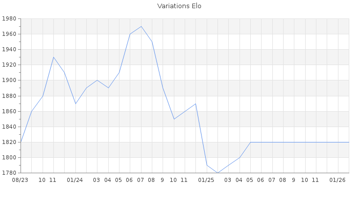 Date d'inscription : 15/08/23. Donateur pour EchecsEmail : Non ( Cliquez ici pour soutenir EchecsEmail. ) Elo non arrondi:1795.7 ( 235 sur 463 joueurs ) Nombre de victoires :115 Nombre de nulles :26 Nombre de défaites :64 Temps de réponse moyen par coup : 0J 14H 26M 52S ( Moyenne sur 5 coups ). Rd ( Un petit rd indique un elo fiable ) : 82 Elo maximum atteint ( en étant classé ) :1970 Elo maximum atteint cette année :0 Nombre coups joués : 7433 Classement coupe : Inactif, date de la dernière qualification : 05/01/25 Points coupe : 17.05 Classement Coupe Magic Chess : Inactif Points Coupe Magic Chess : 0 Tournoi échelle : Inactif. Tournois gagnés : 28/05/2025 : Cat 3 : Victoire dans le tournoi n°26660 17/07/2024 : Cat 4 : Victoire dans le tournoi n°25877 08/07/2024 : Cat 3 : Victoire dans le tournoi n°25744 03/11/2023 : Cat 3 : Victoire dans le tournoi n°25289 20/10/2023 : Cat 3 : Premier au tournoi multi Automne 2023 n°4 09/10/2023 : Cat 2 : Victoire dans le tournoi n°25155 11/09/2023 : Cat 1 : Victoire dans le tournoi n°25156 08/09/2023 : Cat 1 : Victoire dans le tournoi n°25106 03/09/2023 : Cat 1 : Victoire dans le tournoi n°25149 Nombre de tournois gagnés :10