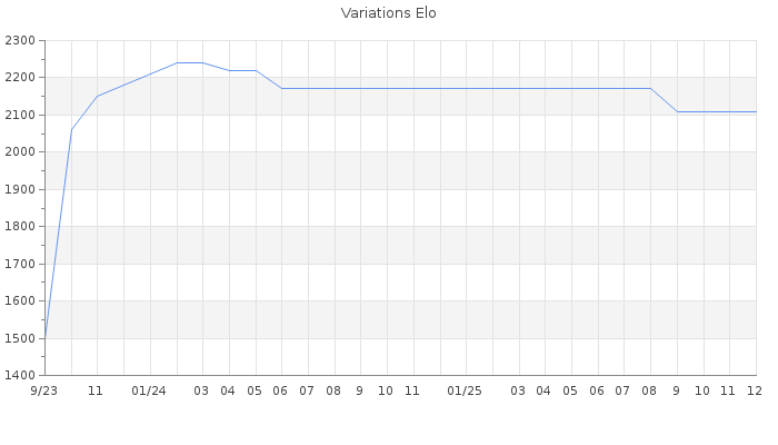 Date d'inscription : 28/09/23. Donateur pour EchecsEmail : Non ( Cliquez ici pour soutenir EchecsEmail. ) Elo non arrondi:2103.9 ( 90 sur 448 joueurs ) Nombre de victoires :83 Nombre de nulles :7 Nombre de défaites :44 Temps de réponse moyen par coup : 0J 1H 19M 43S ( Moyenne sur 2 coups ). Rd ( Un petit rd indique un elo fiable ) : 131 Elo maximum atteint ( en étant classé ) :2260 Elo maximum atteint cette année :2110 Nombre coups joués : 4077 Classement coupe : 91 Points coupe : 138.57 Classement Coupe Magic Chess : Inactif Points Coupe Magic Chess : 0 Tournoi échelle : Inactif. Tournois gagnés : 11/04/2024 : Cat 5 : Victoire dans le tournoi n°25478 04/02/2024 : Cat 5 : Victoire dans le tournoi n°25344 27/10/2023 : Cat 4 : Victoire dans le tournoi n°25279 06/10/2023 : Cat 2 : Victoire dans le tournoi n°25268 Nombre de tournois gagnés :4