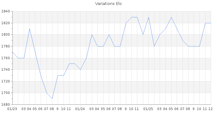 Date d'inscription : 12/09/07. Donateur pour EchecsEmail : Oui ( Cliquez ici pour soutenir EchecsEmail. ) Elo non arrondi:1819.6 ( 211 sur 448 joueurs ) Nombre de victoires :2322 Nombre de nulles :791 Nombre de défaites :2702 Temps de réponse moyen par coup : 0J 2H 43M 2S ( Moyenne sur 1273 coups ). Rd ( Un petit rd indique un elo fiable ) : 50 Magic Elo:1600 Magic Rd : 350 Elo maximum atteint ( en étant classé ) :2050 Elo maximum atteint cette année :1870 Nombre coups joués : 220873 Classement coupe : Inactif Points coupe : 0 Classement Coupe Magic Chess : Inactif Points Coupe Magic Chess : 0 Tournoi échelle : Tournois gagnés : 16/11/2025 : Cat 3 : Victoire dans le tournoi n°27205 05/11/2025 : Cat 3 : Victoire dans le tournoi n°27178 13/05/2025 : Cat 4 : Victoire dans le tournoi n°26667 16/01/2025 : Cat 4 : Victoire dans le tournoi n°26422 30/10/2024 : Cat 3 : Victoire dans le tournoi n°26006 16/10/2024 : Cat 4 : Victoire dans le tournoi n°26118 07/10/2024 : Cat 3 : Victoire dans le tournoi n°26087 26/09/2024 : Cat 4 : Victoire dans le tournoi n°26014 21/09/2024 : Cat 3 : Victoire dans le tournoi n°25978 05/05/2024 : Cat 3 : Victoire dans le tournoi n°25786 08/03/2024 : Cat 3 : Victoire dans le tournoi n°25597 26/11/2023 : Cat 3 : Victoire dans le tournoi n°25382 02/11/2023 : Cat 3 : Victoire dans le tournoi n°25245 03/10/2023 : Cat 3 : Victoire dans le tournoi n°25219 24/07/2023 : Cat 3 : Victoire dans le tournoi n°24904 09/05/2023 : Cat 3 : Victoire dans le tournoi n°24814 20/12/2022 : Cat 3 : Victoire dans le tournoi n°24485 16/12/2022 : Cat 3 : Victoire dans le tournoi n°24464 13/12/2022 : Cat 3 : Victoire dans le tournoi n°24455 03/12/2022 : Cat 3 : Victoire dans le tournoi n°24418 01/12/2022 : Cat 3 : Victoire dans le tournoi n°24426 24/11/2022 : Cat 3 : Victoire dans le tournoi n°24400 05/10/2022 : Cat 3 : Victoire dans le tournoi n°24299 16/08/2022 : Cat 3 : Victoire dans le tournoi n°24171 11/07/2022 : Cat 3 : Victoire dans le tournoi n°24070 25/06/2022 : Cat 3 : Victoire dans le tournoi n°24035 24/06/2022 : Cat 3 : Victoire dans le tournoi n°23933 02/06/2022 : Cat 3 : Victoire dans le tournoi n°23974 06/05/2022 : Cat 3 : Victoire dans le tournoi n°23835 11/01/2022 : Cat 4 : Victoire dans le tournoi n°23470 23/12/2021 : Cat 4 : Victoire dans le tournoi n°23408 12/12/2021 : Cat 4 : Victoire dans le tournoi n°23374 04/12/2021 : Cat 4 : Victoire dans le tournoi n°23365 03/12/2021 : Cat 4 : Victoire dans le tournoi n°23343 25/11/2021 : Cat 4 : Victoire dans le tournoi n°23328 25/07/2021 : Cat 4 : Victoire dans le tournoi n°22942 12/07/2021 : Cat 4 : Victoire dans le tournoi n°22889 01/06/2021 : Cat 3 : Victoire dans le tournoi n°22836 13/05/2021 : Cat 3 : Victoire dans le tournoi n°22710 18/04/2021 : Cat 3 : Victoire dans le tournoi n°22587 07/04/2021 : Cat 3 : Victoire dans le tournoi n°22537 29/03/2021 : Cat 3 : Victoire dans le tournoi n°22606 12/03/2021 : Cat 3 : Victoire dans le tournoi n°22370 05/03/2021 : Cat 3 : Victoire dans le tournoi n°22482 22/02/2021 : Cat 3 : Victoire dans le tournoi n°22411 16/02/2021 : Cat 3 : Victoire dans le tournoi n°22380 30/01/2021 : Cat 3 : Victoire dans le tournoi n°22356 28/01/2021 : Cat 3 : Victoire dans le tournoi n°22306 21/10/2020 : Cat 4 : Victoire dans le tournoi n°21891 20/10/2020 : Cat 4 : Victoire dans le tournoi n°21156 19/10/2020 : Cat 4 : Victoire dans le tournoi n°21801 12/09/2020 : Cat 3 : Victoire dans le tournoi n°21718 02/09/2020 : Cat 3 : Victoire dans le tournoi n°21618 30/08/2020 : Cat 3 : Victoire dans le tournoi n°21680 16/08/2020 : Cat 3 : Victoire dans le tournoi n°21527 15/06/2020 : Cat 3 : Victoire dans le tournoi n°21302 05/03/2020 : Cat 4 : Victoire dans le tournoi n°20697 28/02/2020 : Cat 4 : Victoire dans le tournoi n°20673 01/02/2020 : Cat 4 : Victoire dans le tournoi n°20683 30/11/2019 : Cat 4 : Victoire dans le tournoi n°20318 20/10/2019 : Cat 3 : Victoire dans le tournoi n°20099 13/09/2019 : Cat 3 : Victoire dans le tournoi n°20050 08/09/2019 : Cat 3 : Victoire dans le tournoi n°20003 27/08/2019 : Cat 3 : Victoire dans le tournoi n°20078 30/06/2019 : Cat 4 : Victoire dans le tournoi n°19713 13/05/2019 : Cat 4 : Victoire dans le tournoi n°19564 14/04/2019 : Cat 4 : Victoire dans le tournoi n°19475 10/02/2019 : Cat 4 : Victoire dans le tournoi n°19051 30/01/2019 : Cat 4 : Victoire dans le tournoi n°19203 19/01/2019 : Cat 4 : Victoire dans le tournoi n°18948 26/10/2018 : Cat 4 : Victoire dans le tournoi n°18773 05/02/2018 : Cat 4 : Victoire dans le tournoi n°17543 24/06/2017 : Cat 4 : Victoire dans le tournoi n°16643 22/06/2017 : Cat 4 : Victoire dans le tournoi n°16661 11/04/2017 : Cat 4 : Victoire dans le tournoi n°16366 28/02/2017 : Cat 4 : Victoire dans le tournoi n°15934 17/02/2017 : Cat 4 : Victoire dans le tournoi n°16132 20/10/2016 : Cat 4 : Victoire dans le tournoi n°15551 20/08/2016 : Cat 4 : Victoire dans le tournoi n°15249 16/03/2016 : Cat 4 : Victoire dans le tournoi n°14529 05/03/2016 : Cat 4 : Victoire dans le tournoi n°14321 24/01/2016 : Cat 4 : Victoire dans le tournoi n°18732 26/10/2015 : Cat 4 : Victoire dans le tournoi n°17970 26/10/2015 : Cat 4 : Victoire dans le tournoi n°17796 04/05/2015 : Cat 4 : Victoire dans le tournoi n°17218 08/02/2015 : Cat 4 : Victoire dans le tournoi n°16411 01/09/2014 : Cat 4 : Victoire dans le tournoi n°15561 29/08/2014 : Cat 4 : Victoire dans le tournoi n°15542 02/04/2014 : Cat 4 : Victoire dans le tournoi n°14822 26/03/2014 : Cat 4 : Victoire dans le tournoi n°14853 25/03/2014 : Cat 4 : Victoire dans le tournoi n°14816 21/03/2014 : Cat 4 : Victoire dans le tournoi n°14879 13/12/2013 : Cat 4 : Victoire dans le tournoi n°14020 27/10/2013 : Cat 4 : Victoire dans le tournoi n°13435 19/10/2013 : Cat 4 : Victoire dans le tournoi n°13357 12/10/2013 : Cat 4 : Victoire dans le tournoi n°13258 11/09/2013 : Cat 4 : Victoire dans le tournoi n°12947 10/08/2013 : Cat 4 :