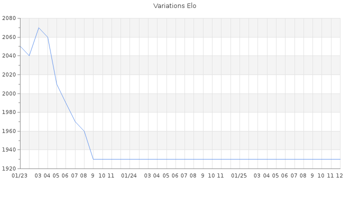 Date d'inscription : 19/01/23. Donateur pour EchecsEmail : Non ( Cliquez ici pour soutenir EchecsEmail. ) Elo non arrondi:1898.4 ( 194 sur 448 joueurs ) Nombre de victoires :79 Nombre de nulles :11 Nombre de défaites :50 Temps de réponse moyen par coup : 0J 10H 9M 37S ( Moyenne sur 0 coups ). Rd ( Un petit rd indique un elo fiable ) : 70 Magic Elo:1700 Magic Rd : 350 Elo maximum atteint ( en étant classé ) :2130 Elo maximum atteint cette année :0 Nombre coups joués : 4557 Classement coupe : Inactif, date de la dernière qualification : 01/04/23 Points coupe : 52.67 Classement Coupe Magic Chess : Inactif Points Coupe Magic Chess : 0 Tournoi échelle : Inactif. Tournois gagnés : 31/03/2023 : Cat 4 : Victoire dans le tournoi n°24719 23/03/2023 : Cat 3 : Premier au tournoi multi Saint-Valentin 2023 n°5 10/03/2023 : Cat 4 : Victoire dans le tournoi n°24641 18/02/2023 : Cat 4 : Victoire dans le tournoi n°24656 13/02/2023 : Cat 3 : Victoire dans le tournoi n°24614 Nombre de tournois gagnés :6