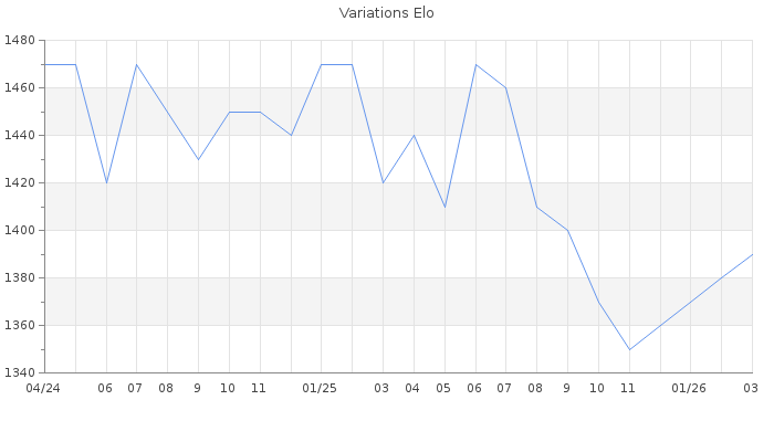 Date d'inscription : 04/04/24. Donateur pour EchecsEmail : Non ( Cliquez ici pour soutenir EchecsEmail. ) Elo non arrondi:1393.4 ( 400 sur 446 joueurs ) Nombre de victoires :117 Nombre de nulles :8 Nombre de défaites :331 Temps de réponse moyen par coup : 0J 11H 6M 55S ( Moyenne sur 906 coups ). Rd ( Un petit rd indique un elo fiable ) : 74 Magic Elo:1351.4 Magic Rd : 278 Elo maximum atteint ( en étant classé ) :1600 Elo maximum atteint cette année :1390 Nombre coups joués : 17410 Inscrit dans l' équipe:Avalon Classement coupe : Inactif, date de la dernière qualification : 08/08/24 Points coupe : 3.39 Classement Coupe Magic Chess : Inactif Points Coupe Magic Chess : 0 Tournoi échelle : Inactif. Tournois gagnés : 01/03/2025 : Cat 1 : Victoire dans le tournoi n°26535 27/01/2025 : Cat 1 : Victoire dans le tournoi n°26387 Nombre de tournois gagnés :2
