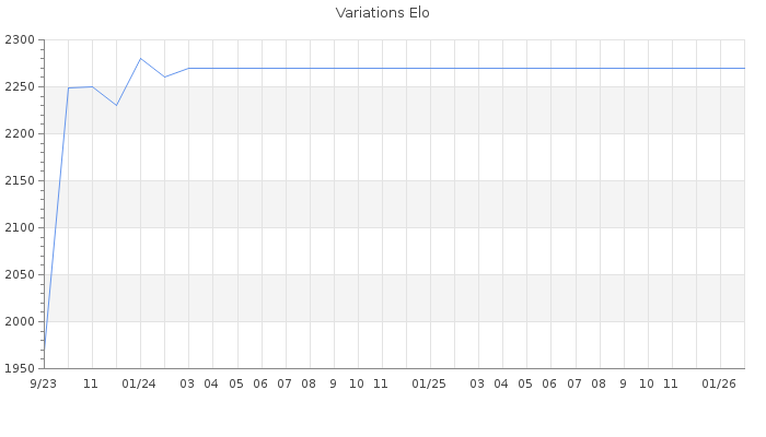 Date d'inscription : 02/09/23. Donateur pour EchecsEmail : Non ( Cliquez ici pour soutenir EchecsEmail. ) Elo non arrondi:2243.5 ( 61 sur 459 joueurs ) Nombre de victoires :4 Nombre de nulles :14 Nombre de défaites :5 Temps de réponse moyen par coup : 0J 2H 2M 42S ( Moyenne sur 0 coups ). Rd ( Un petit rd indique un elo fiable ) : 99 Elo maximum atteint ( en étant classé ) :2280 Elo maximum atteint cette année :0 Nombre coups joués : 629 Classement coupe : Inactif Points coupe : 0 Classement Coupe Magic Chess : Inactif Points Coupe Magic Chess : 0 Tournoi échelle : Nombre de tournois gagnés :0