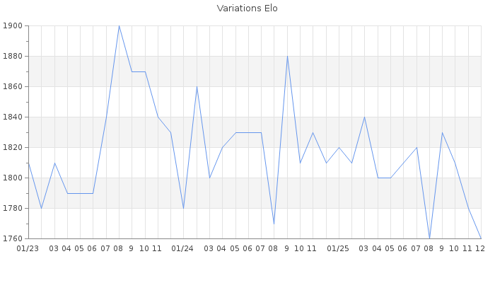 Date d'inscription : 13/04/06. Donateur pour EchecsEmail : Non ( Cliquez ici pour soutenir EchecsEmail. ) Elo non arrondi:1758.4 ( 244 sur 449 joueurs ) Nombre de victoires :4522 Nombre de nulles :469 Nombre de défaites :4864 Temps de réponse moyen par coup : 0J 2H 21M 39S ( Moyenne sur 4170 coups ). Rd ( Un petit rd indique un elo fiable ) : 51 Magic Elo:1703.31 Magic Rd : 80 Elo maximum atteint ( en étant classé ) :1990 Elo maximum atteint cette année :1880 Nombre coups joués : 378994 Inscrit dans l' équipe:No Game No Life Classement coupe : 21 Points coupe : 3467.12 Classement Coupe Magic Chess : Inactif Points Coupe Magic Chess : 0 Tournoi échelle : Division 1 : 3 Tournois gagnés : 25/09/2025 : Cat 3 : Victoire dans le tournoi n°27069 19/09/2025 : Cat 3 : Victoire dans le tournoi n°27031 07/09/2025 : Cat 3 : Victoire dans le tournoi n°27019 02/12/2024 : Cat 3 : Victoire dans le tournoi n°26271 19/11/2024 : Cat 3 : Victoire dans le tournoi n°26254 15/09/2024 : Cat 3 : Victoire dans le tournoi n°26069 31/08/2024 : Cat 3 : Victoire dans le tournoi n°26052 15/01/2024 : Cat 4 : Victoire dans le tournoi n°25514 09/05/2023 : Cat 4 : Victoire dans le tournoi n°24811 22/04/2023 : Cat 3 : Victoire dans le tournoi n°24791 28/10/2022 : Cat 4 : Victoire dans le tournoi n°24228 14/07/2022 : Cat 4 : Victoire dans le tournoi n°24087 15/06/2022 : Cat 3 : Victoire dans le tournoi n°24001 12/12/2021 : Cat 4 : Victoire dans le tournoi n°23400 13/09/2021 : Cat 3 : Victoire dans le tournoi n°23124 20/07/2021 : Cat 3 : Victoire dans le tournoi n°22973 27/05/2021 : Cat 3 : Victoire dans le tournoi n°22776 16/04/2021 : Cat 3 : Victoire dans le tournoi n°22637 25/11/2020 : Cat 3 : Victoire dans le tournoi n°22032 01/10/2020 : Cat 3 : Victoire dans le tournoi n°21696 20/06/2020 : Cat 3 : Victoire dans le tournoi n°21313 21/08/2019 : Cat 2 : Victoire CC Aut19 Asc 09/08/2019 : Cat 3 : Victoire dans le tournoi n°19954 27/07/2019 : Cat 3 : Victoire dans le tournoi n°19941 13/07/2019 : Cat 3 : Victoire dans le tournoi n°19897 09/06/2019 : Cat 4 : Victoire dans le tournoi n°19681 28/08/2018 : Cat 3 : Victoire dans le tournoi n°18400 15/02/2018 : Cat 4 : Victoire dans le tournoi n°17695 23/07/2017 : Cat 3 : Victoire dans le tournoi n°16821 08/10/2016 : Cat 4 : Victoire dans le tournoi n°15523 21/06/2016 : Cat 4 : Victoire dans le tournoi n°15018 07/04/2016 : Cat 3 : Victoire dans le tournoi n°14614 11/03/2016 : Cat 4 : Victoire dans le tournoi n°14434 12/02/2016 : Cat 4 : Victoire dans le tournoi n°14345 20/01/2016 : Cat 4 : Victoire dans le tournoi n°19000 08/01/2016 : Cat 3 : Victoire dans le tournoi n°18755 13/12/2015 : Cat 3 : Victoire dans le tournoi n°18867 02/11/2015 : Cat 4 : Victoire dans le tournoi n°18570 19/10/2015 : Cat 3 : Victoire dans le tournoi n°18420 13/10/2015 : Cat 3 : Victoire dans le tournoi n°18519 16/09/2015 : Cat 4 : Victoire dans le tournoi n°18139 08/08/2015 : Cat 3 : Victoire dans le tournoi n°18051 19/07/2015 : Cat 3 : Victoire dans le tournoi n°17233 15/09/2014 : Cat 3 : Victoire dans le tournoi n°15693 13/07/2014 : Cat 3 : Victoire dans le tournoi n°15616 28/03/2014 : Cat 3 : Victoire dans le tournoi n°14950 15/03/2014 : Cat 3 : Victoire dans le tournoi n°14740 06/03/2014 : Cat 3 : Victoire dans le tournoi n°14804 16/02/2014 : Cat 3 : Victoire dans le tournoi n°14612 01/02/2014 : Cat 3 : Victoire dans le tournoi n°14241 04/01/2014 : Cat 3 : Victoire dans le tournoi n°14133 01/01/2014 : Cat 3 : Victoire dans le tournoi n°14095 09/12/2013 : Cat 3 : Victoire dans le tournoi n°14013 11/11/2013 : Cat 3 : Victoire dans le tournoi n°13628 03/09/2013 : Cat 4 : Victoire dans le tournoi n°12972 21/07/2013 : Cat 3 : Victoire dans le tournoi n°12885 20/07/2013 : Cat 0 : Premier au tournoi multi Ete 2013 !!! n°3 26/06/2013 : Cat 3 : Victoire dans le tournoi n°12540 29/08/2012 : Cat 3 : Victoire dans le tournoi n°10726 29/06/2012 : Cat 4 : Victoire dans le tournoi n°10474 04/09/2010 : Cat 4 : Victoire dans le tournoi n°7706 07/08/2010 : Cat 3 : Victoire dans le tournoi n°7619 14/01/2010 : Cat 2 : Victoire dans le tournoi n°6701 19/12/2009 : Cat 2 : Victoire dans le tournoi n°6686 14/12/2009 : Cat 2 : Victoire dans le tournoi n°6689 05/12/2009 : Cat 2 : Victoire dans le tournoi n°6591 26/10/2009 : Cat 3 : Victoire dans le tournoi n°6417 22/10/2009 : Cat 3 : Victoire dans le tournoi n°6373 06/10/2009 : Cat 3 : Victoire dans le tournoi n°6334 03/10/2009 : Cat 2 : Victoire dans le tournoi n°6399 Nombre de tournois gagnés :70