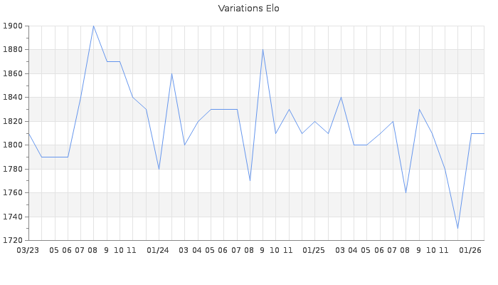 Date d'inscription : 13/04/06. Donateur pour EchecsEmail : Non ( Cliquez ici pour soutenir EchecsEmail. ) Elo non arrondi:1806.2 ( 229 sur 459 joueurs ) Nombre de victoires :4572 Nombre de nulles :477 Nombre de défaites :4910 Temps de réponse moyen par coup : 0J 1H 56M 14S ( Moyenne sur 4679 coups ). Rd ( Un petit rd indique un elo fiable ) : 50 Magic Elo:1703.31 Magic Rd : 80 Elo maximum atteint ( en étant classé ) :1990 Elo maximum atteint cette année :1830 Nombre coups joués : 382849 Inscrit dans l' équipe:No Game No Life Classement coupe : 21 Points coupe : 3334.14 Classement Coupe Magic Chess : Inactif Points Coupe Magic Chess : 0 Tournoi échelle : Division 1 : 3 Tournois gagnés : 22/01/2026 : Cat 3 : Victoire dans le tournoi n°27383 25/09/2025 : Cat 3 : Victoire dans le tournoi n°27069 19/09/2025 : Cat 3 : Victoire dans le tournoi n°27031 07/09/2025 : Cat 3 : Victoire dans le tournoi n°27019 02/12/2024 : Cat 3 : Victoire dans le tournoi n°26271 19/11/2024 : Cat 3 : Victoire dans le tournoi n°26254 15/09/2024 : Cat 3 : Victoire dans le tournoi n°26069 31/08/2024 : Cat 3 : Victoire dans le tournoi n°26052 15/01/2024 : Cat 4 : Victoire dans le tournoi n°25514 09/05/2023 : Cat 4 : Victoire dans le tournoi n°24811 22/04/2023 : Cat 3 : Victoire dans le tournoi n°24791 28/10/2022 : Cat 4 : Victoire dans le tournoi n°24228 14/07/2022 : Cat 4 : Victoire dans le tournoi n°24087 15/06/2022 : Cat 3 : Victoire dans le tournoi n°24001 12/12/2021 : Cat 4 : Victoire dans le tournoi n°23400 13/09/2021 : Cat 3 : Victoire dans le tournoi n°23124 20/07/2021 : Cat 3 : Victoire dans le tournoi n°22973 27/05/2021 : Cat 3 : Victoire dans le tournoi n°22776 16/04/2021 : Cat 3 : Victoire dans le tournoi n°22637 25/11/2020 : Cat 3 : Victoire dans le tournoi n°22032 01/10/2020 : Cat 3 : Victoire dans le tournoi n°21696 20/06/2020 : Cat 3 : Victoire dans le tournoi n°21313 21/08/2019 : Cat 2 : Victoire CC Aut19 Asc 09/08/2019 : Cat 3 : Victoire dans le tournoi n°19954 27/07/2019 : Cat 3 : Victoire dans le tournoi n°19941 13/07/2019 : Cat 3 : Victoire dans le tournoi n°19897 09/06/2019 : Cat 4 : Victoire dans le tournoi n°19681 28/08/2018 : Cat 3 : Victoire dans le tournoi n°18400 15/02/2018 : Cat 4 : Victoire dans le tournoi n°17695 23/07/2017 : Cat 3 : Victoire dans le tournoi n°16821 08/10/2016 : Cat 4 : Victoire dans le tournoi n°15523 21/06/2016 : Cat 4 : Victoire dans le tournoi n°15018 07/04/2016 : Cat 3 : Victoire dans le tournoi n°14614 11/03/2016 : Cat 4 : Victoire dans le tournoi n°14434 12/02/2016 : Cat 4 : Victoire dans le tournoi n°14345 20/01/2016 : Cat 4 : Victoire dans le tournoi n°19000 08/01/2016 : Cat 3 : Victoire dans le tournoi n°18755 13/12/2015 : Cat 3 : Victoire dans le tournoi n°18867 02/11/2015 : Cat 4 : Victoire dans le tournoi n°18570 19/10/2015 : Cat 3 : Victoire dans le tournoi n°18420 13/10/2015 : Cat 3 : Victoire dans le tournoi n°18519 16/09/2015 : Cat 4 : Victoire dans le tournoi n°18139 08/08/2015 : Cat 3 : Victoire dans le tournoi n°18051 19/07/2015 : Cat 3 : Victoire dans le tournoi n°17233 15/09/2014 : Cat 3 : Victoire dans le tournoi n°15693 13/07/2014 : Cat 3 : Victoire dans le tournoi n°15616 28/03/2014 : Cat 3 : Victoire dans le tournoi n°14950 15/03/2014 : Cat 3 : Victoire dans le tournoi n°14740 06/03/2014 : Cat 3 : Victoire dans le tournoi n°14804 16/02/2014 : Cat 3 : Victoire dans le tournoi n°14612 01/02/2014 : Cat 3 : Victoire dans le tournoi n°14241 04/01/2014 : Cat 3 : Victoire dans le tournoi n°14133 01/01/2014 : Cat 3 : Victoire dans le tournoi n°14095 09/12/2013 : Cat 3 : Victoire dans le tournoi n°14013 11/11/2013 : Cat 3 : Victoire dans le tournoi n°13628 03/09/2013 : Cat 4 : Victoire dans le tournoi n°12972 21/07/2013 : Cat 3 : Victoire dans le tournoi n°12885 20/07/2013 : Cat 0 : Premier au tournoi multi Ete 2013 !!! n°3 26/06/2013 : Cat 3 : Victoire dans le tournoi n°12540 29/08/2012 : Cat 3 : Victoire dans le tournoi n°10726 29/06/2012 : Cat 4 : Victoire dans le tournoi n°10474 04/09/2010 : Cat 4 : Victoire dans le tournoi n°7706 07/08/2010 : Cat 3 : Victoire dans le tournoi n°7619 14/01/2010 : Cat 2 : Victoire dans le tournoi n°6701 19/12/2009 : Cat 2 : Victoire dans le tournoi n°6686 14/12/2009 : Cat 2 : Victoire dans le tournoi n°6689 05/12/2009 : Cat 2 : Victoire dans le tournoi n°6591 26/10/2009 : Cat 3 : Victoire dans le tournoi n°6417 22/10/2009 : Cat 3 : Victoire dans le tournoi n°6373 06/10/2009 : Cat 3 : Victoire dans le tournoi n°6334 03/10/2009 : Cat 2 : Victoire dans le tournoi n°6399 Nombre de tournois gagnés :71
