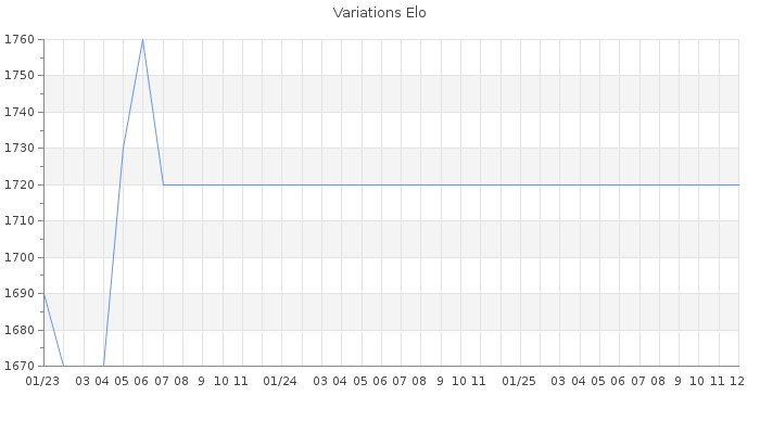 Date d'inscription : 17/08/15. Donateur pour EchecsEmail : Oui ( Cliquez ici pour soutenir EchecsEmail. ) Elo non arrondi:1688 ( 307 sur 449 joueurs ) Nombre de victoires :177 Nombre de nulles :15 Nombre de défaites :202 Temps de réponse moyen par coup : 0J 19H 52M 4S ( Moyenne sur 0 coups ). Rd ( Un petit rd indique un elo fiable ) : 91 Magic Elo:1600 Magic Rd : 350 Elo maximum atteint ( en étant classé ) :1910 Elo maximum atteint cette année :0 Nombre coups joués : 14761 Classement coupe : Inactif Points coupe : 0 Classement Coupe Magic Chess : Inactif Points Coupe Magic Chess : 0 Tournoi échelle : Inactif. Tournois gagnés : 04/06/2023 : Cat 2 : Victoire dans le tournoi n°24887 09/03/2020 : Cat 3 : Victoire dans le tournoi n°20688 06/03/2019 : Cat 2 : Victoire dans le tournoi n°18956 07/10/2015 : Cat 0 : Victoire dans le tournoi n°18308 01/09/2015 : Cat 0 : Victoire dans le tournoi n°18262 Nombre de tournois gagnés :5